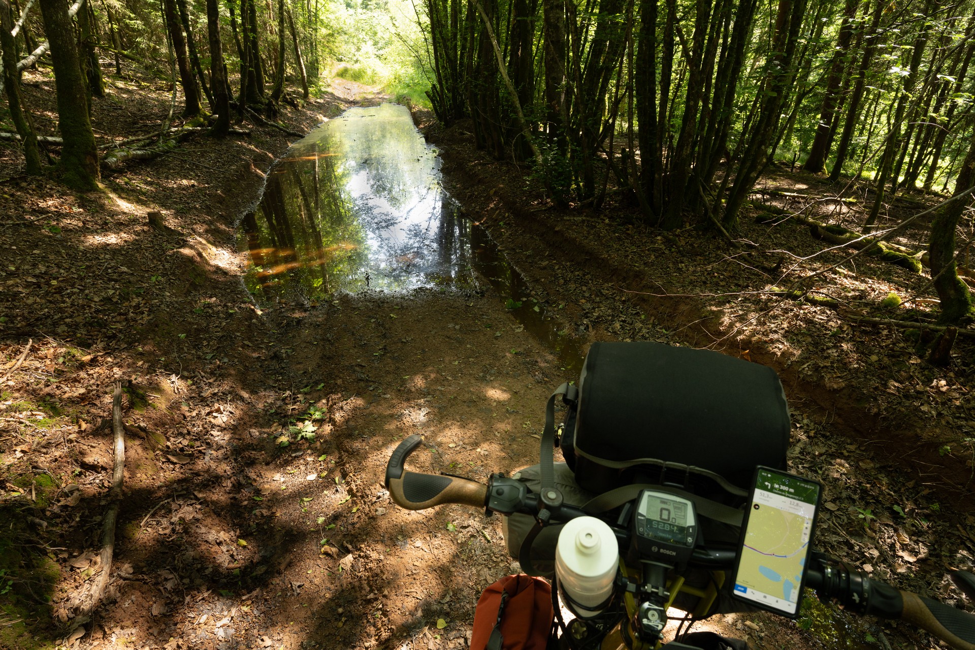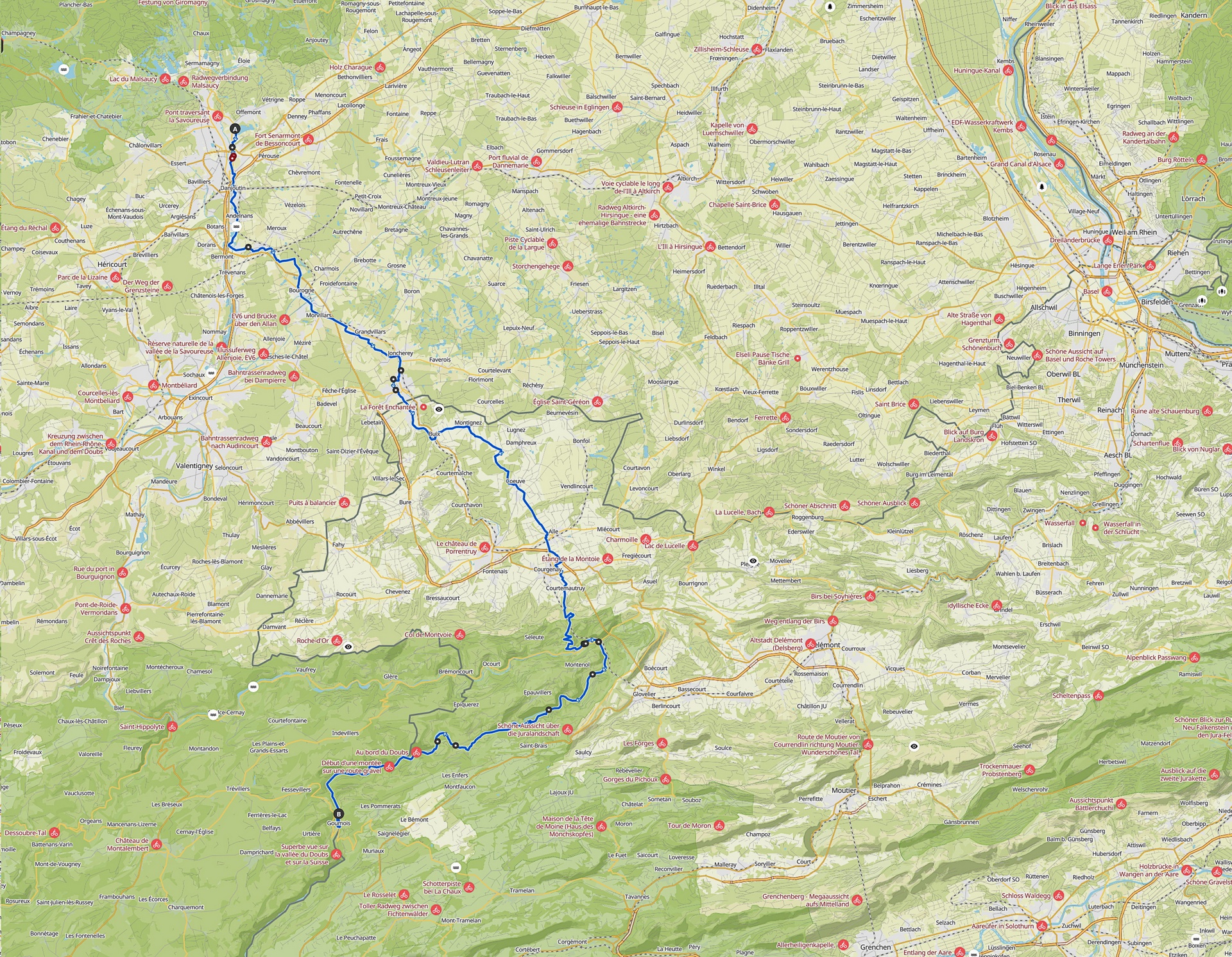 Ich bin auf dem matschigen Uferweg der Doubs angekommen auf meinem Zeltplatz. Der liegt wieder in Frankreich. Die Mitte der Doubs ist die Grenze. Wunderschöne Strecke.