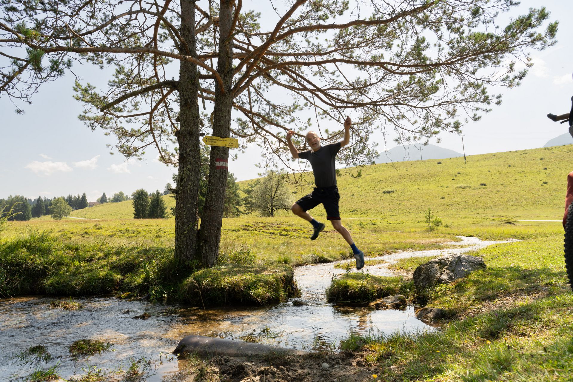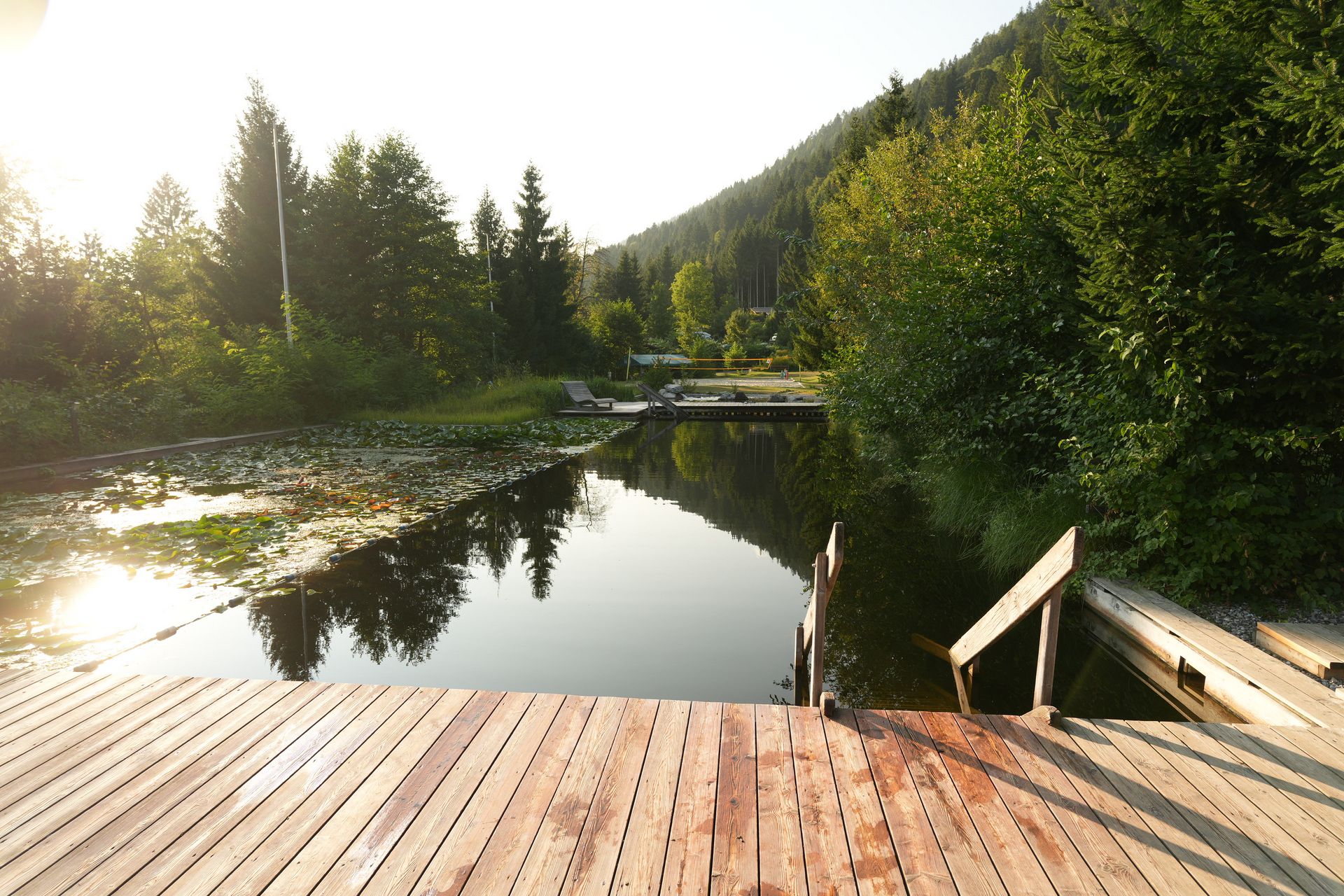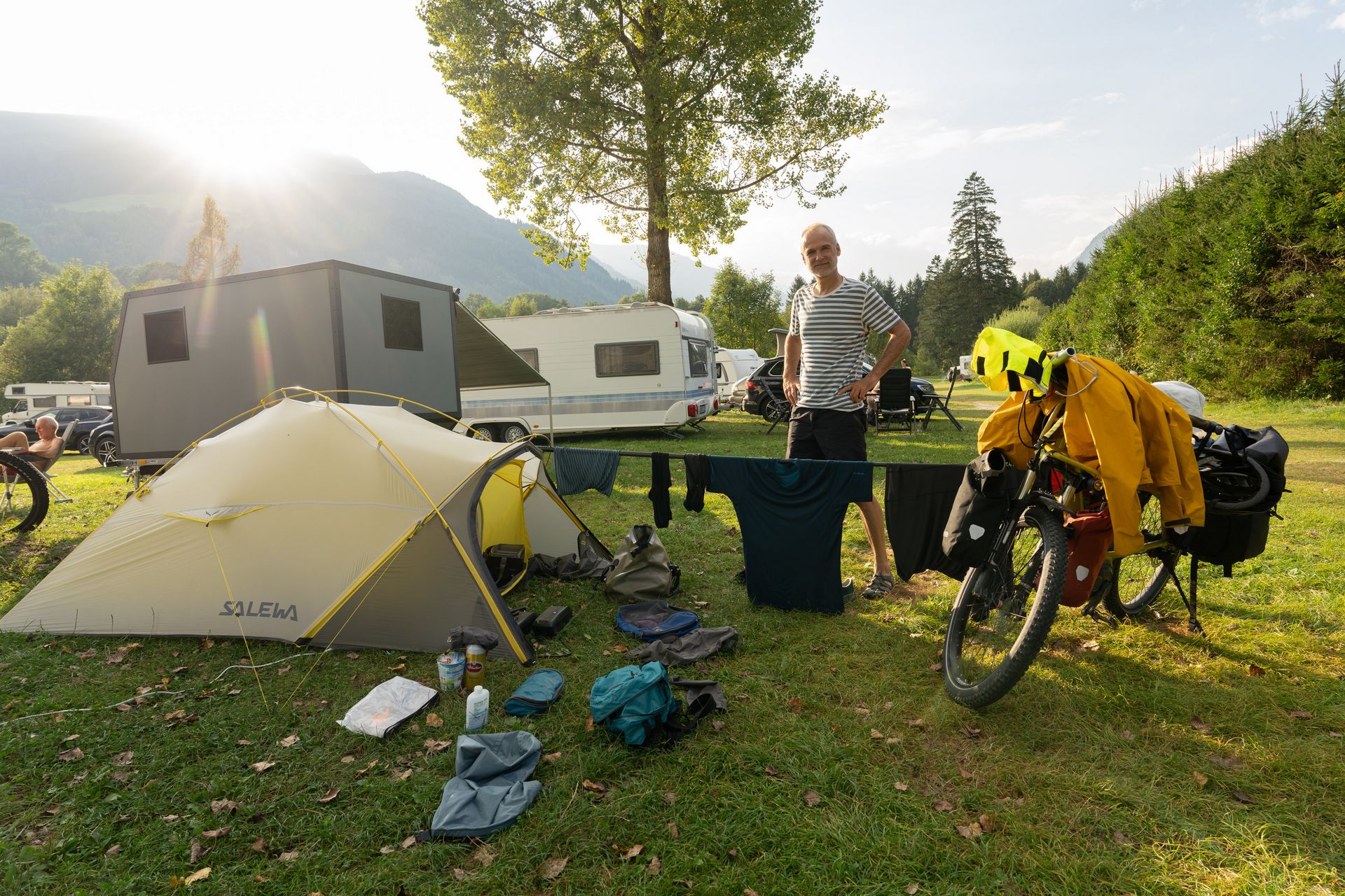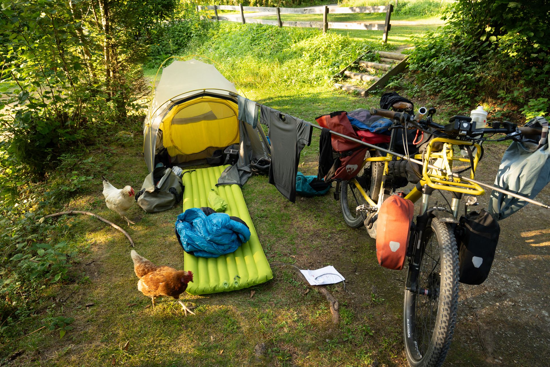 Das war lang heute. Aber bei gutem Wetter ist es leichter. Der Zeltplatz ist was besonderes. Da ist ein Naturschwimmbad und zwei Hühner, die das Gelände erkunden.