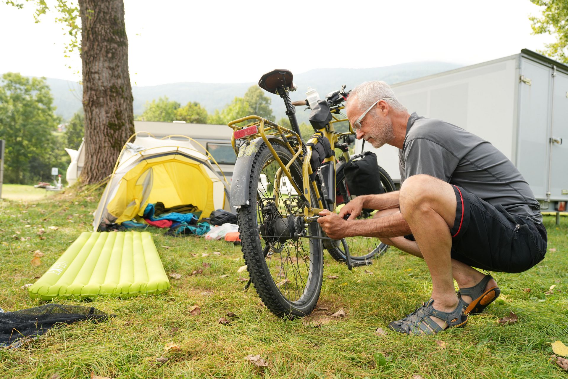 Nach Besichtigung der Burg und einem doppelten Mokka geht es zur Mittagsruhe auf den Zeltplatz. Ich muss mal die Schrauben am Rad festziehen. Es sind immer dieselben Schrauben, die ich trotz Loctite nicht dauerhaft fest kriege. Bei allen meinen Rädern lockern sich die Schrauben des Fahrradständers. Die Rohloffschaltung hat aufgehört Öl zu schwitzen. Der Ölsumpf ist wohl leer. Da muss ich einfach hoffen, dass die Schaltung noch 1000 km durchhält.