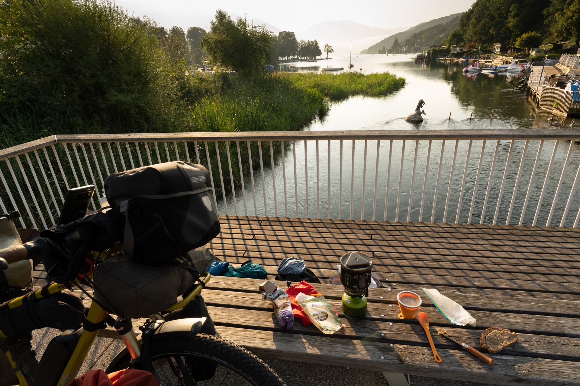 Heute ist der erste Tag, an dem kein Regen angekündigt ist. Ich muss für 2 Tage einkaufen, denn auf den ausgewählten Sträßchen wird erst morgen Nachmittag ein Laden zu finden sein. Der Aldi macht erst um 8:00 Uhr auf. Also gibt es zuerst an der Ufer Promenade von Seeboden ein Frühstück.