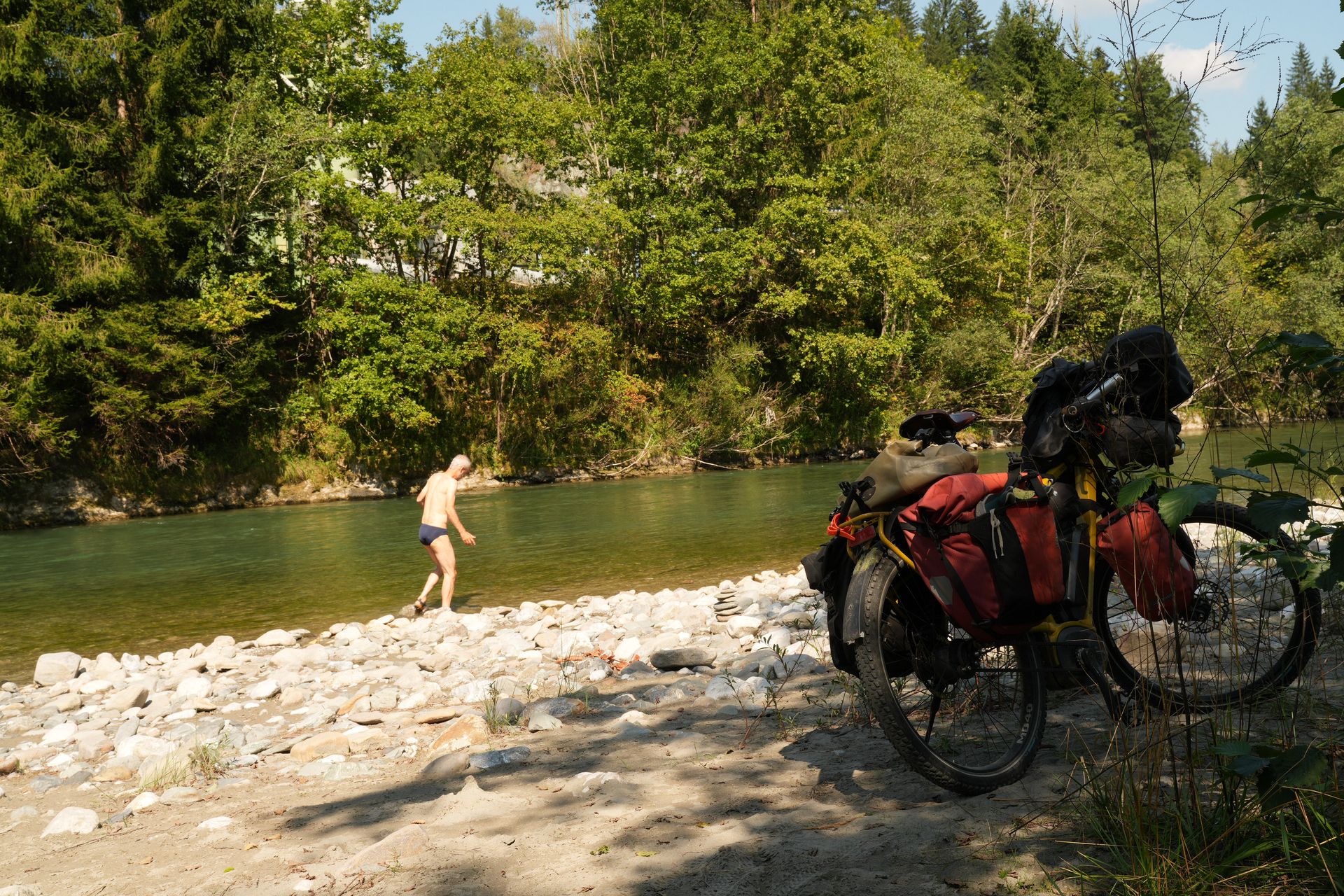 Jetzt bin ich heute gleich zweimal schwimmen gegangen. In der Gail, das ist hier das Gailtal und die schönste Frau im Tal ist die Gailtalerin. Ist ein kaltes Flüsschen mit einsamen Kiesel Stränden.