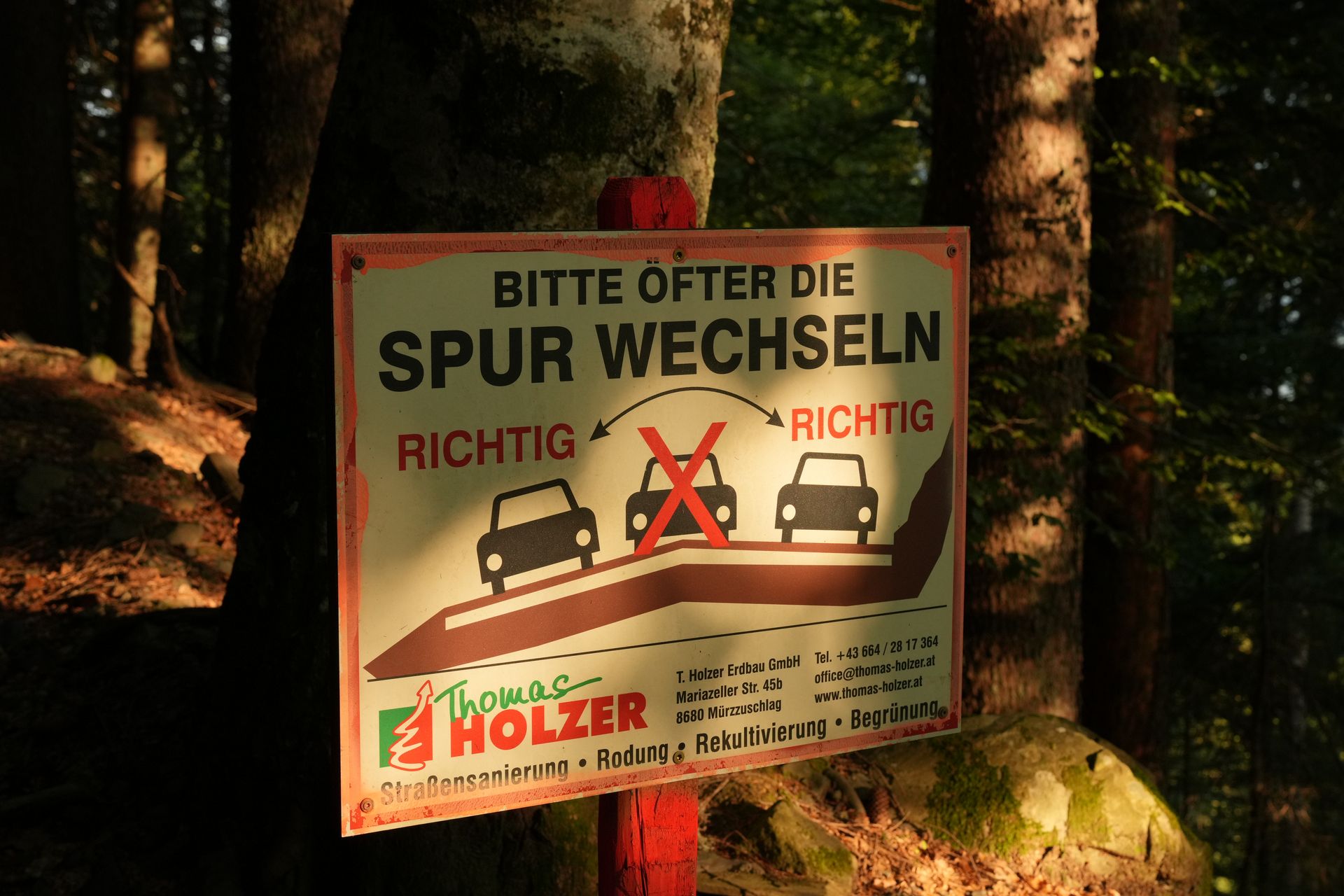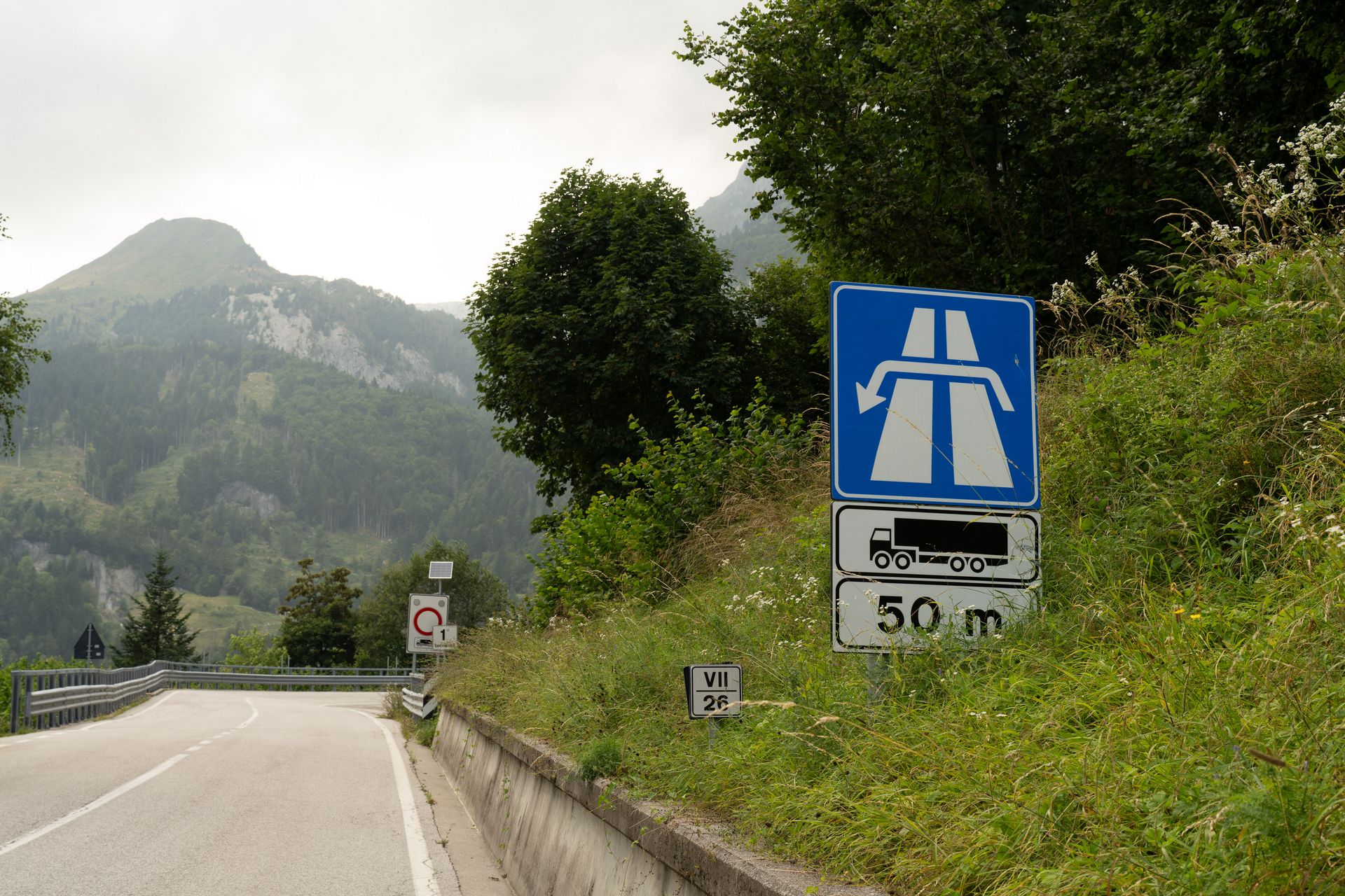 Der Plöckenpass ist gesperrt, aber ich kann genau noch zu der Stelle fahren, ab der es wieder auf Schotterwegen in die Berge geht. Es gab so ein Autobahnschild ziemlich unmotiviert auf dieser Pass Straße. Deswegen will Google und Co ein Fahrrad da nicht durchlassen.