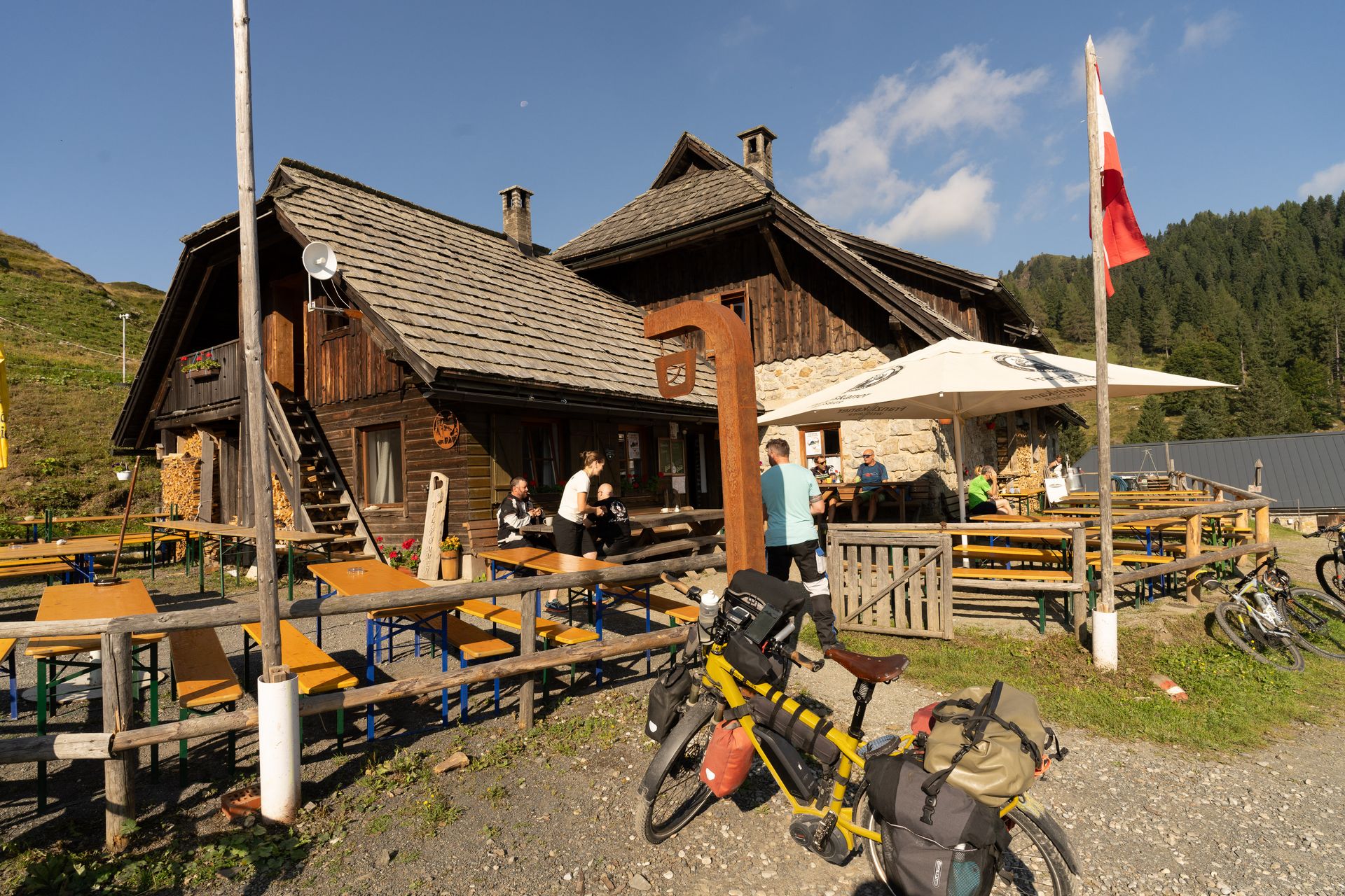 14 km geht es auf herrlich steilem Schotter Richtung Italien. Die ersten 900 HM habe ich auf einer bewirtschafteten Alm geschafft. Ich gönne mir Cappuccino mit Käsebrot. Ich habe das total verdattelt, dass morgen Sonntag ist und ich heute vielleicht auch nichts einkaufen kann.