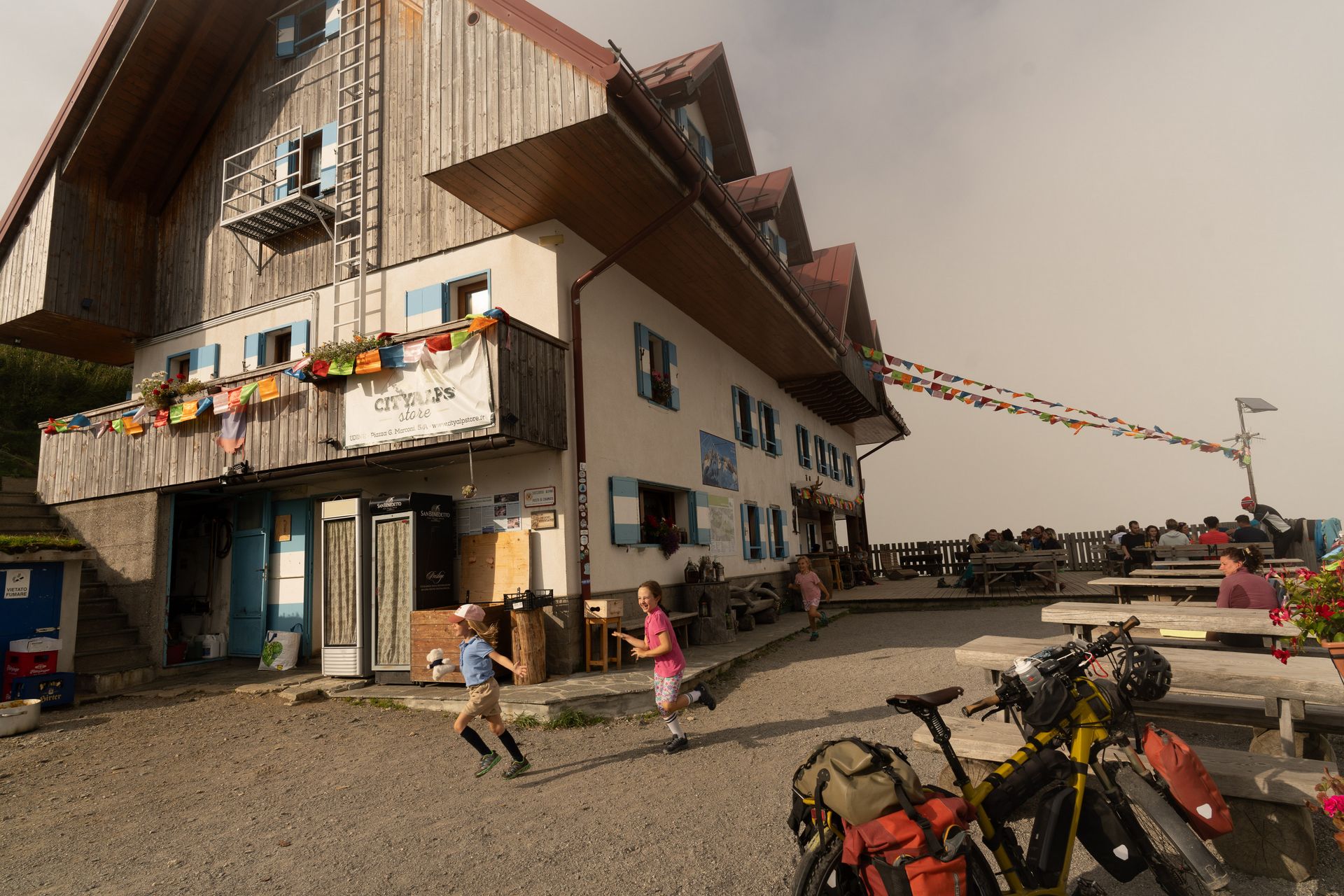 Im grandiosen Alpenpanorama geht der schmale Weg sehr steil zur Hütte hoch. Ich bin immer im kleinsten Gang und habe den Motor auf höchste Unterstützung. Man braucht einfach eine gewisse Geschwindigkeit auf den groben Steinen, sonst steigt man immer wieder vom Rad. Und das Anfahren am Berg ist dann arg schwer für mich. Ich kann alles fahren bis auf den letzten Kilometer. Da muss ich eben schieben.