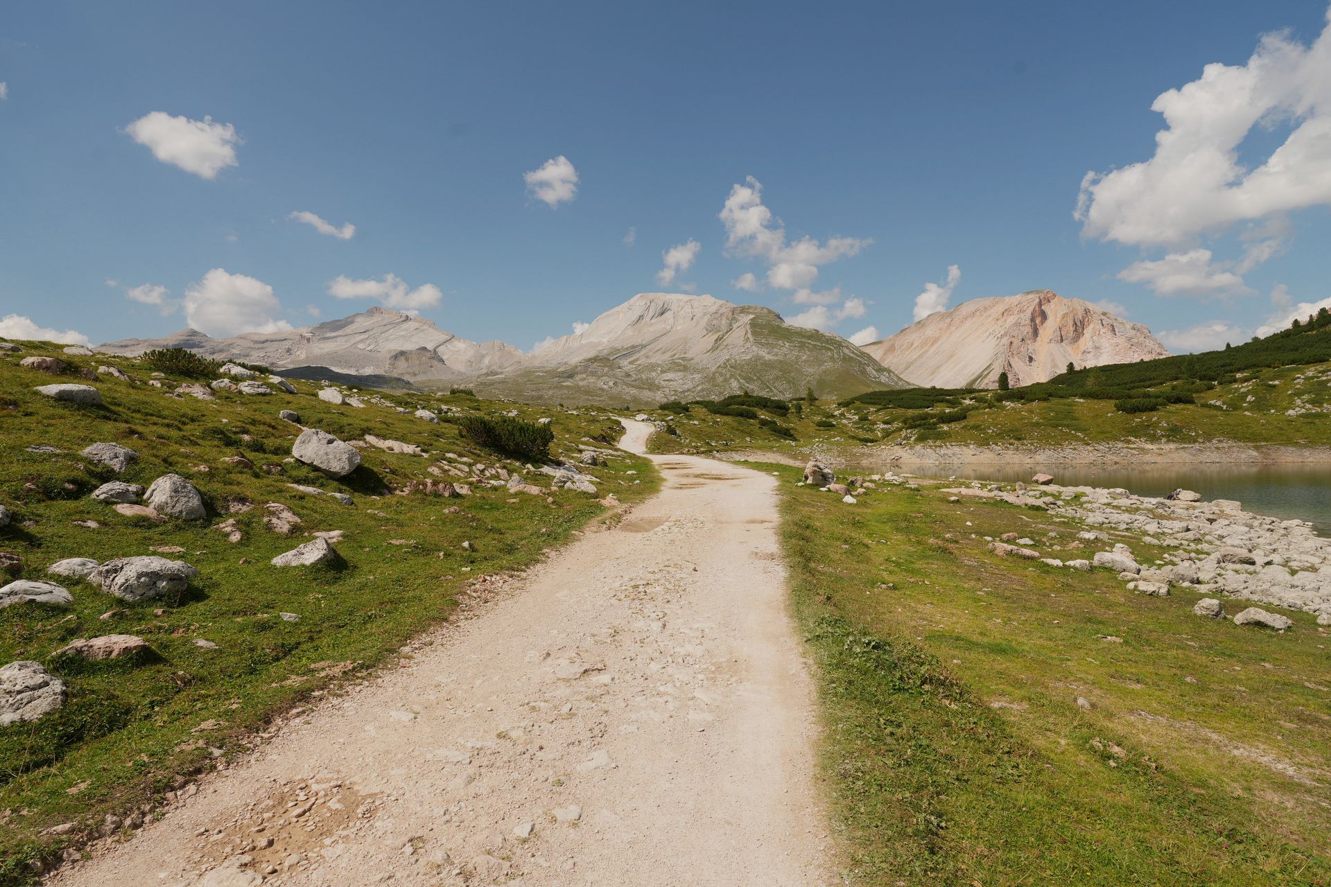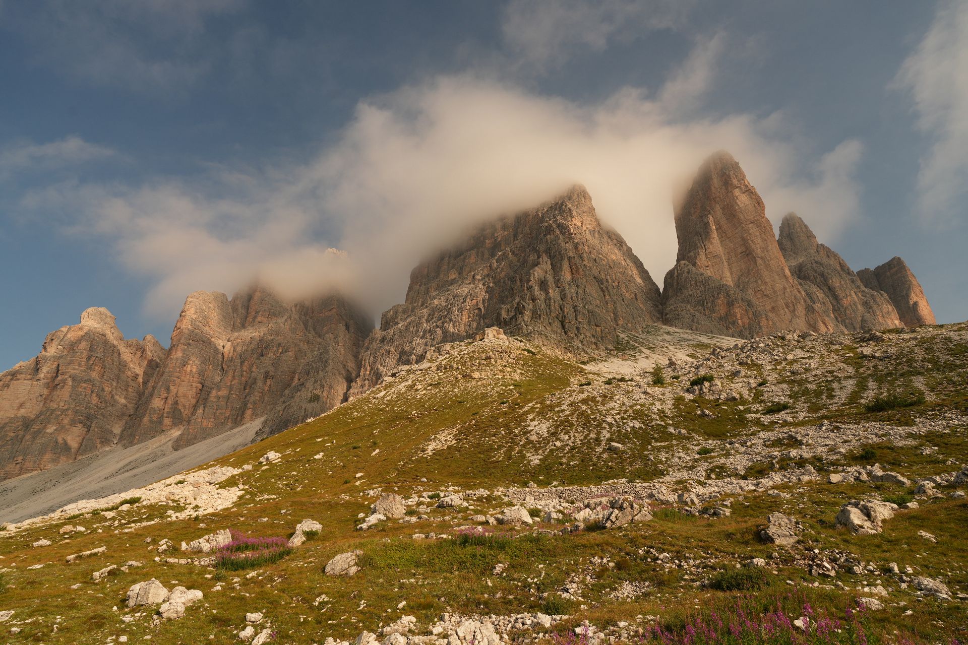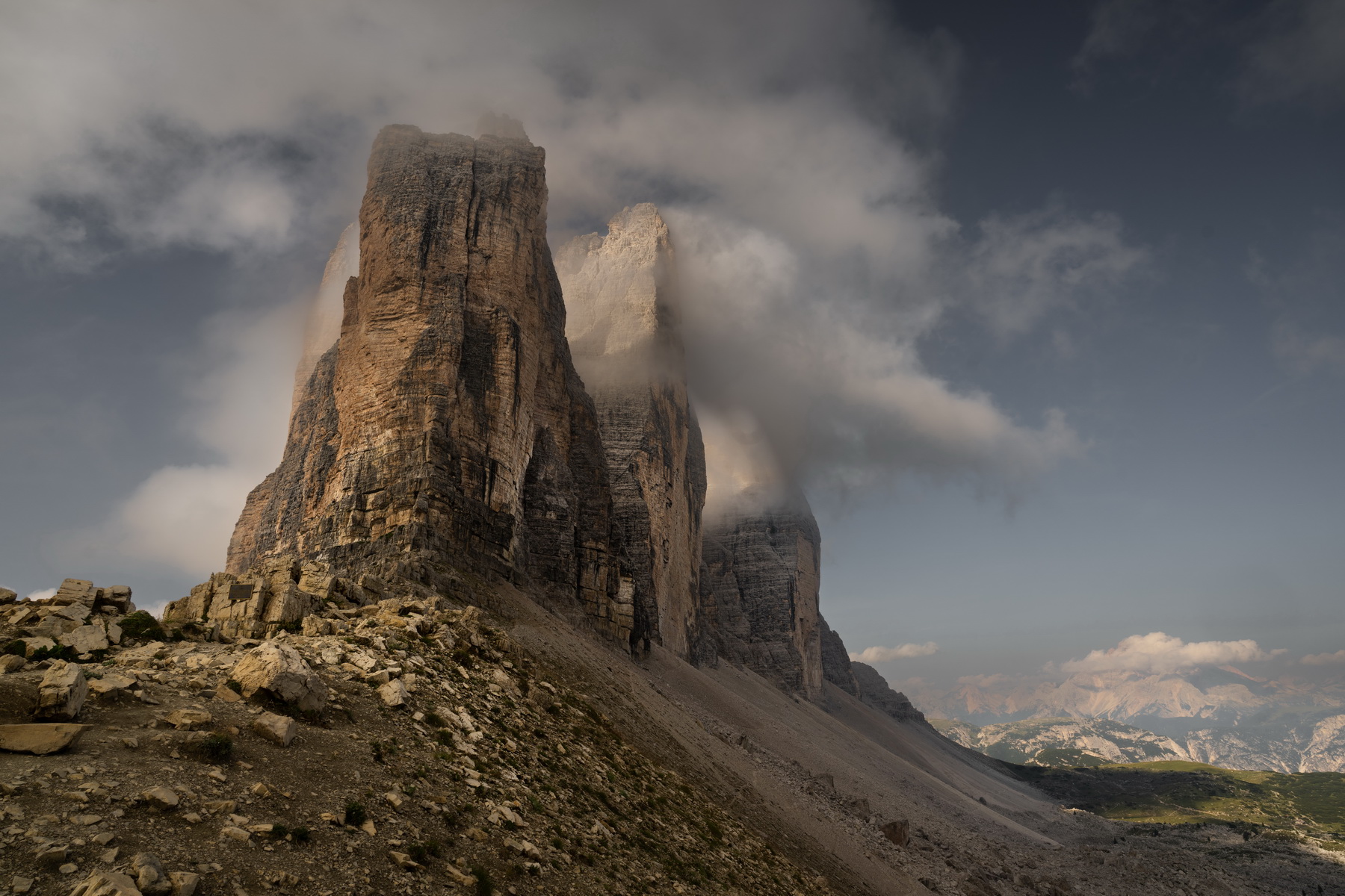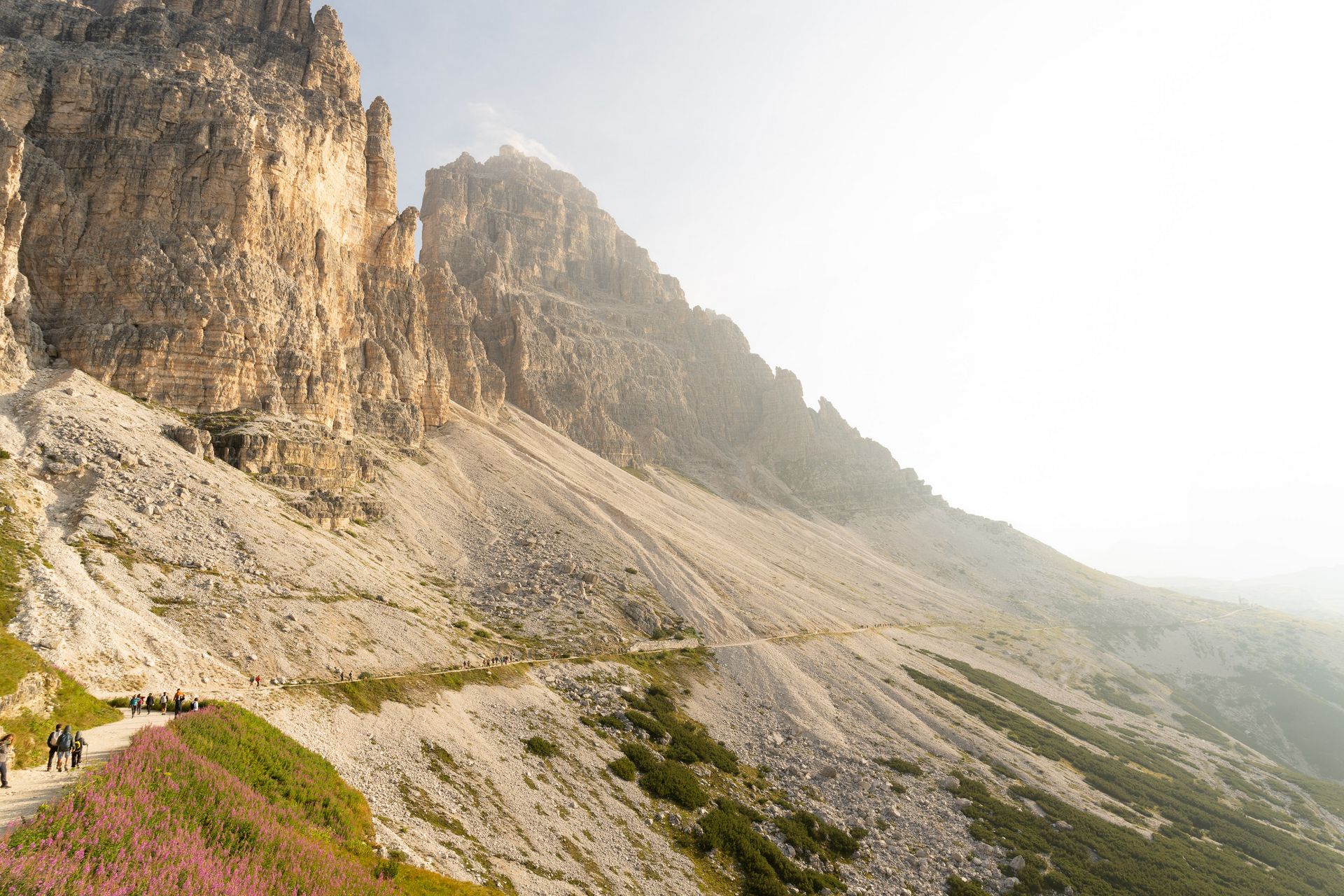 Ich wache früh auf, weil jede Menge Verkehr durch mein Zelt fährt. Aufstehen ist deutlich leichter, wenn man sich nicht anziehen muß. Der Kälte wegen habe ich in kompletter Montur geschlafen. Kurz noch Kalorien oben eingeworfen und hoch zur Auronzohütte, um die drei Zinnen zu umwandern.