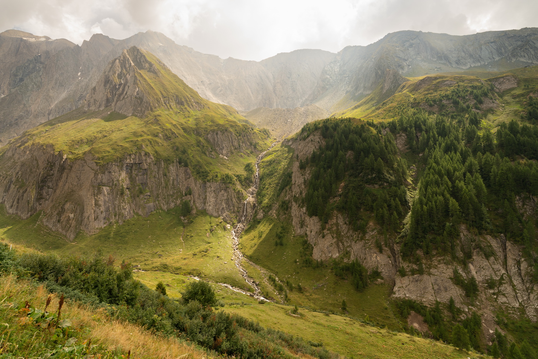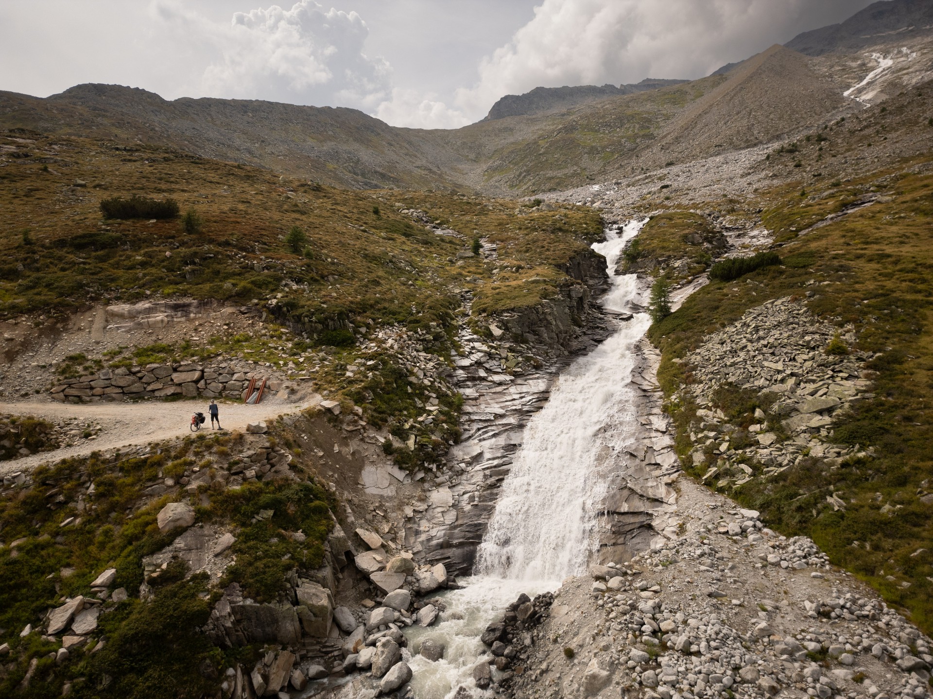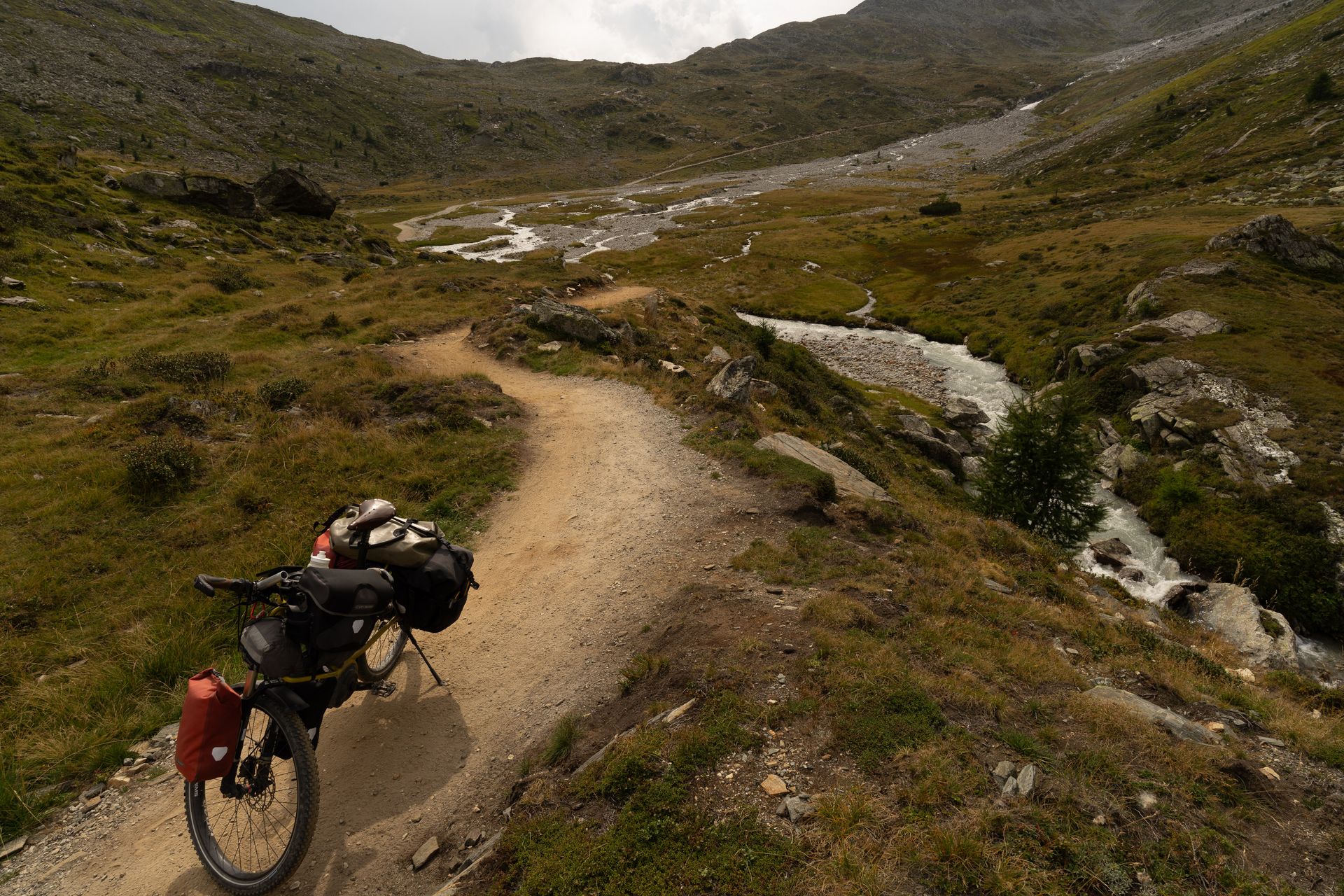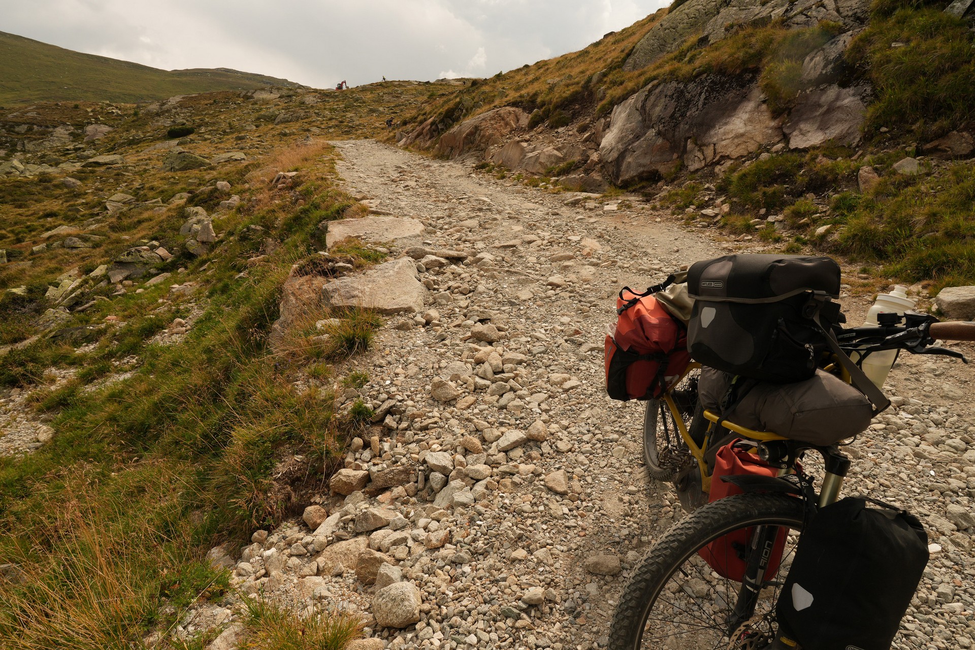 Oben am Joch bin ich ganz allein. Es hat sich schon gelohnt, die Messe sausen zu lassen. Der Weg runter ist jetzt technisch nicht schwierig, aber es geht elend steil seitlich runter, so dass ich 2 km lang das Fahrrad schiebe. Der Himmel rumpelt dunkel und ich flüchte in die Nafingalm. Es gibt richtig leckere Penne und ich kann den Regen aussitzen.