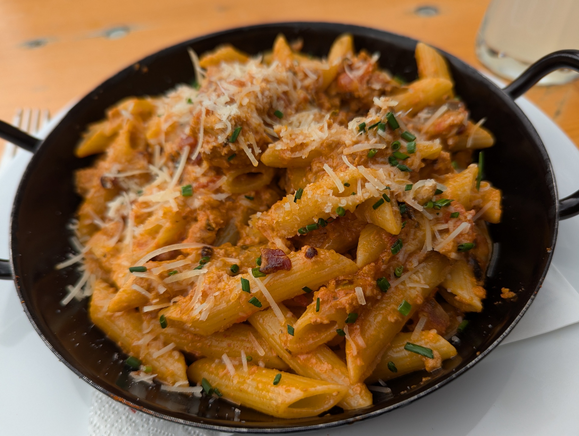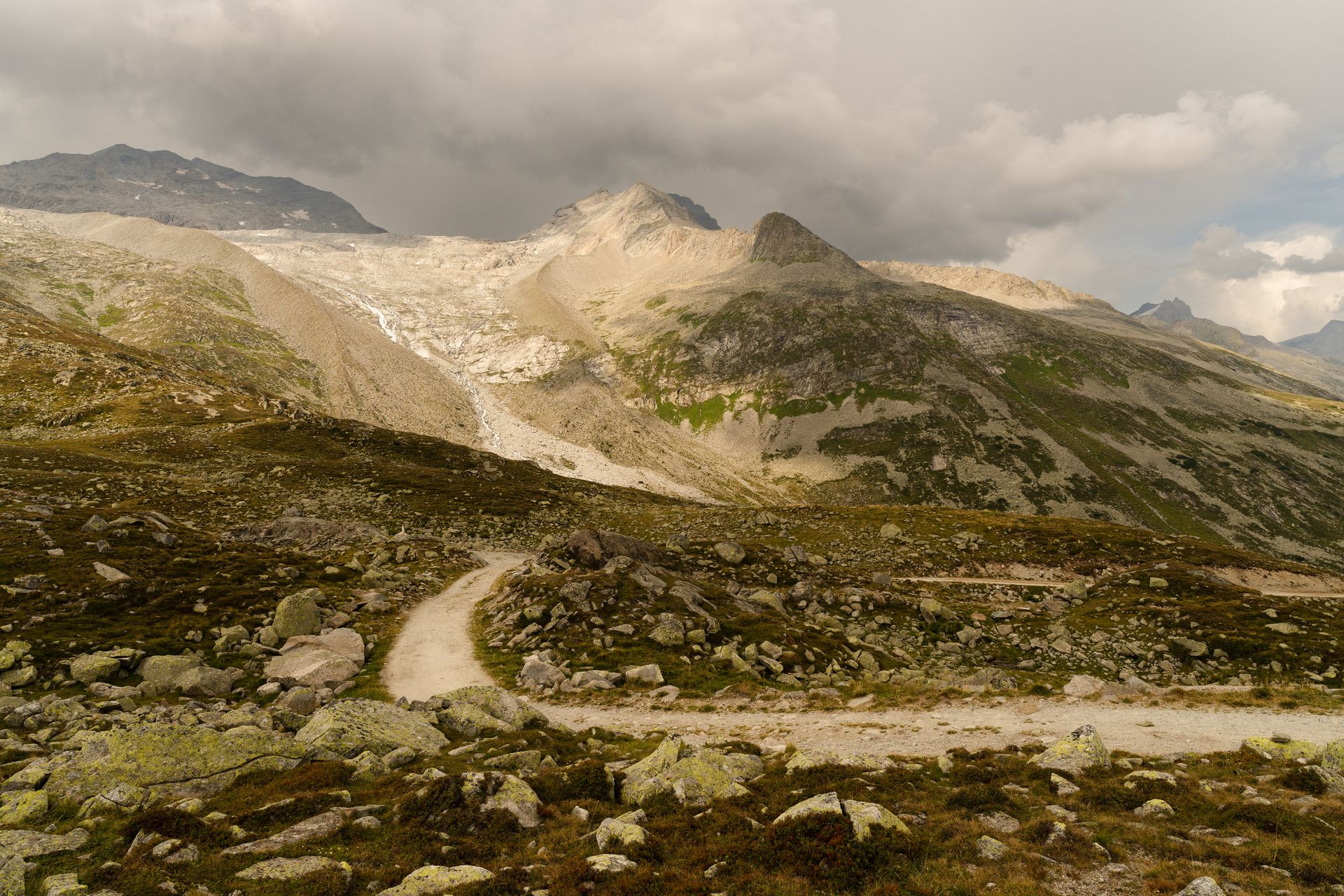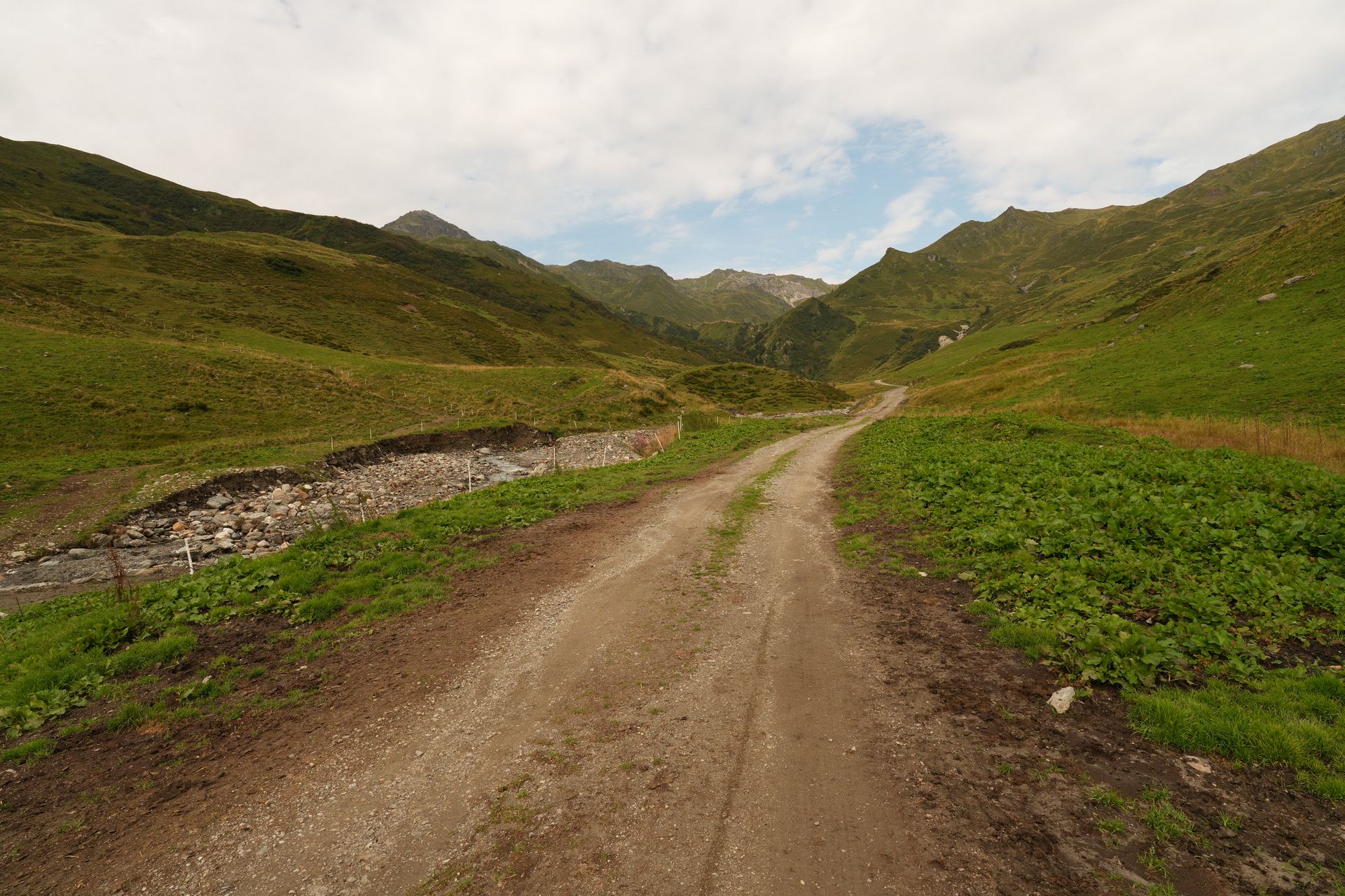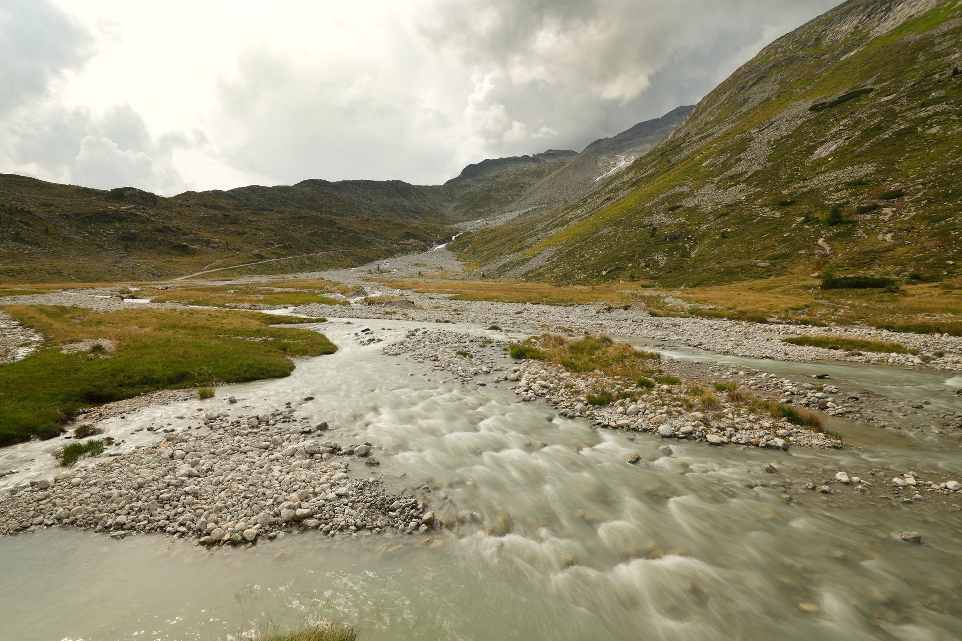 Oben am Joch bin ich ganz allein. Es hat sich schon gelohnt, die Messe sausen zu lassen. Der Weg runter ist jetzt technisch nicht schwierig, aber es geht elend steil seitlich runter, so dass ich 2 km lang das Fahrrad schiebe. Der Himmel rumpelt dunkel und ich flüchte in die Nafingalm. Es gibt richtig leckere Penne und ich kann den Regen aussitzen.