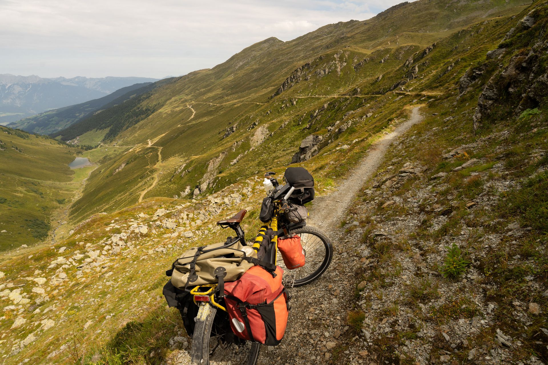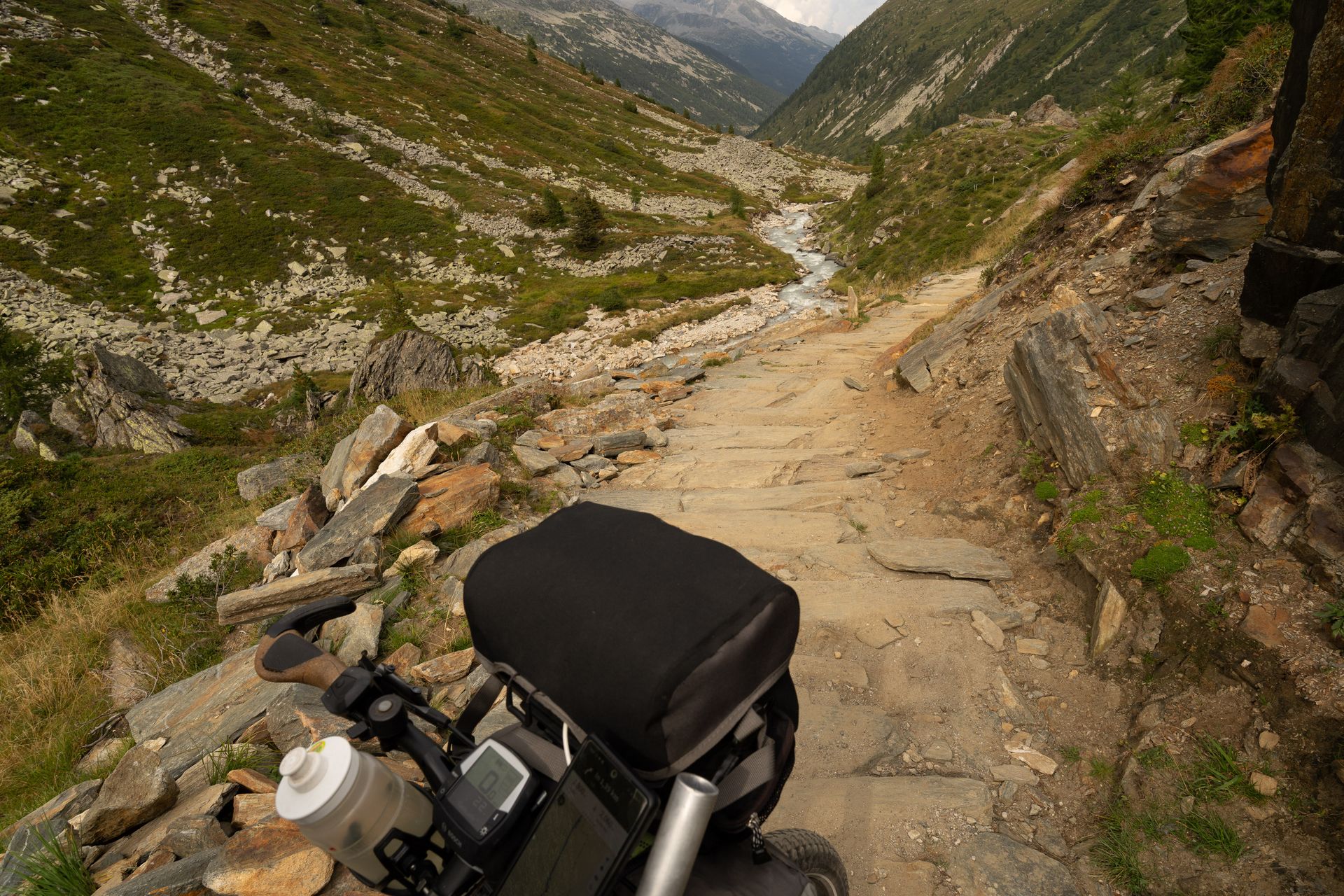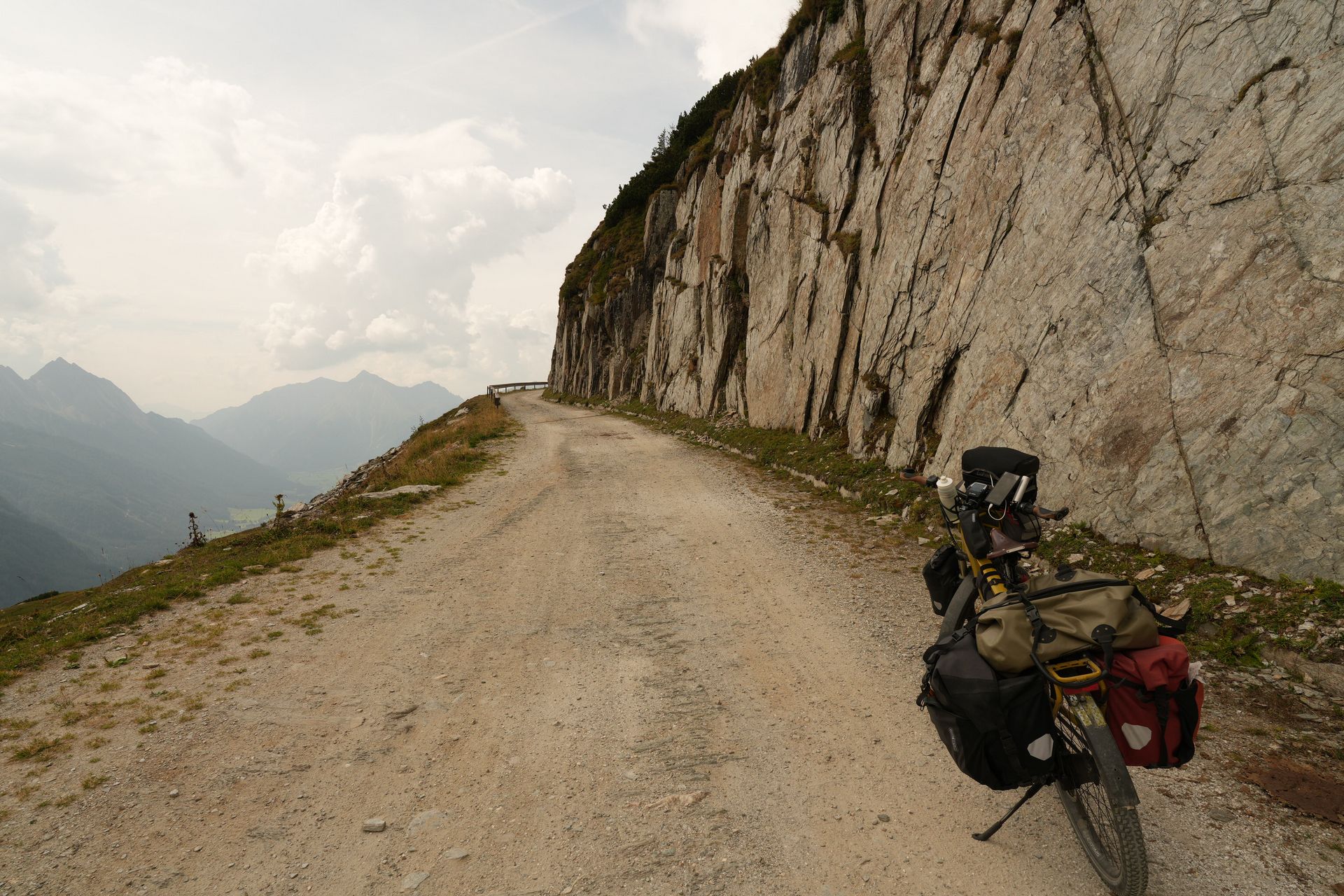 Es geht hoch auf dem üblichen Schotter. Das Pfitscherjoch liegt mit 2300 MH fast 1000 M höher als der benachbarte Brennerpass. Was man nicht alles macht, nur dass man nicht kontrolliert wird. Die Abwärtsstrecke vom Joch herunter war schon heftig. Der Weg besteht aus groben Steinplatten, über die ich das Fahrrad nur ganz langsam schieben kann. Oder es liegt Kindskopf großer Schotter auf dem Weg, wo das Fahrrad überall hin will, nur nicht geradeaus. Kindskopf eben. Jetzt um 17:00 Uhr habe ich es geschafft. Noch 30km zum Zeltplatz in Mayrhofen und ich sollte noch einkaufen. Morgen ist Sonntag.