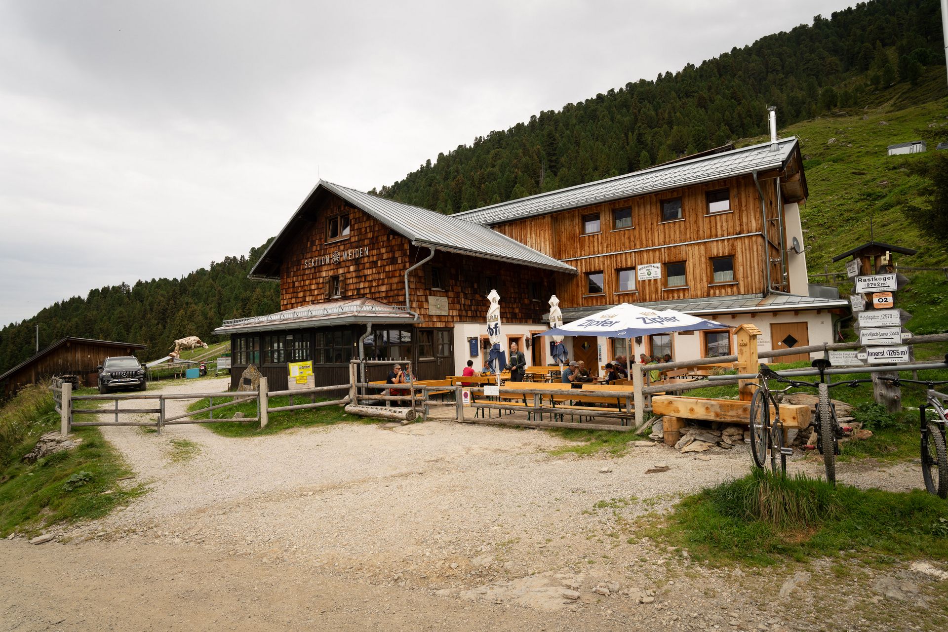 Fast 2000 HM geht's runter ins flache Inntal. Endlose Maisfelder wechseln sich mit Gewerbegebieten ab. Wenn man nicht den gesamten Winter zur Routenplanung nutzt, sieht so wahrscheinlich Österreich aus. Trotzdem gibt es hier einen ganz okayischen Camping. Der Platz ist gut gefüllt und vor jedem Zelt, Bus oder Wohnwagen sitzen nachmittags die Menschen. Jetzt fährst du aus Schweden, Holland oder Tschechien hierher in den Urlaub und setzt dich den ganzen Tag vor dein Fahrzeug. Vermutlich war jeder an seinem ersten Tag kurz draußen und denkt sich: Maisfelder kenne ich schon. Da haben wir gebucht und bezahlt, bleiben wir hier und machen es uns gemütlich.