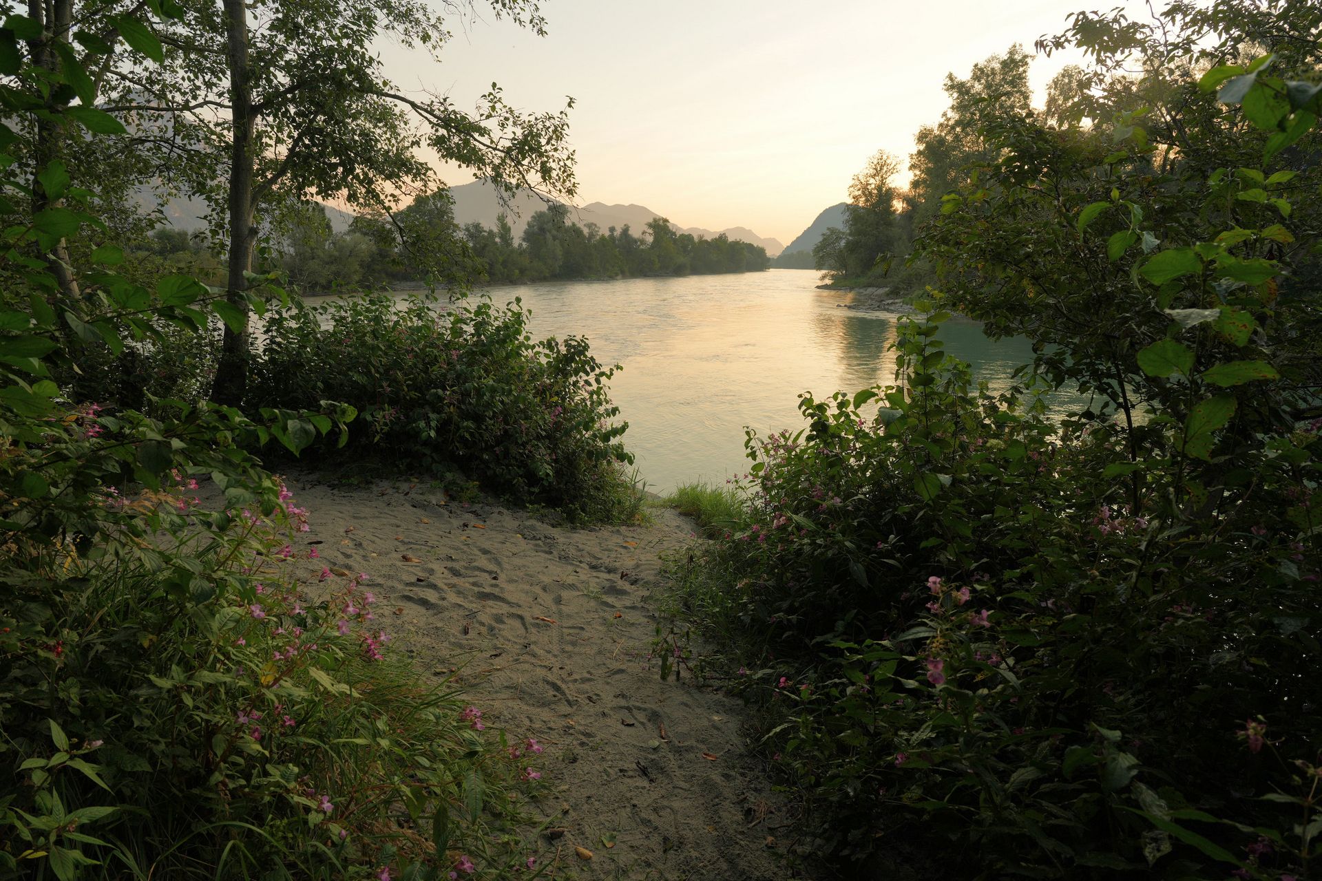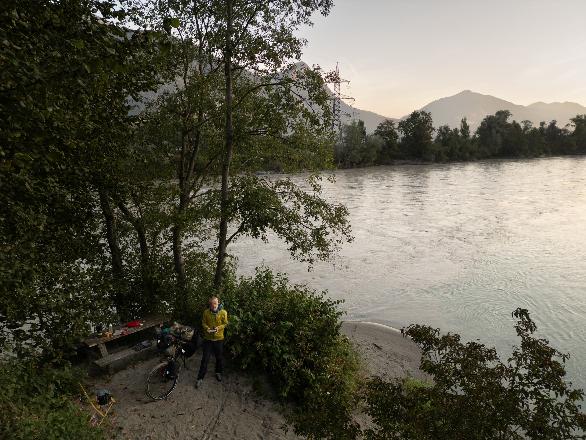 Im frühen Morgennebel sehen auch die Schlote von Duisburg malerisch aus. Das kann der Inn mit seiner braunen Brühe dann auch. Ich finde eine einsame Uferstelle an einer Landzunge gleich nach der Kläranlage und feiere mein Frühstück.