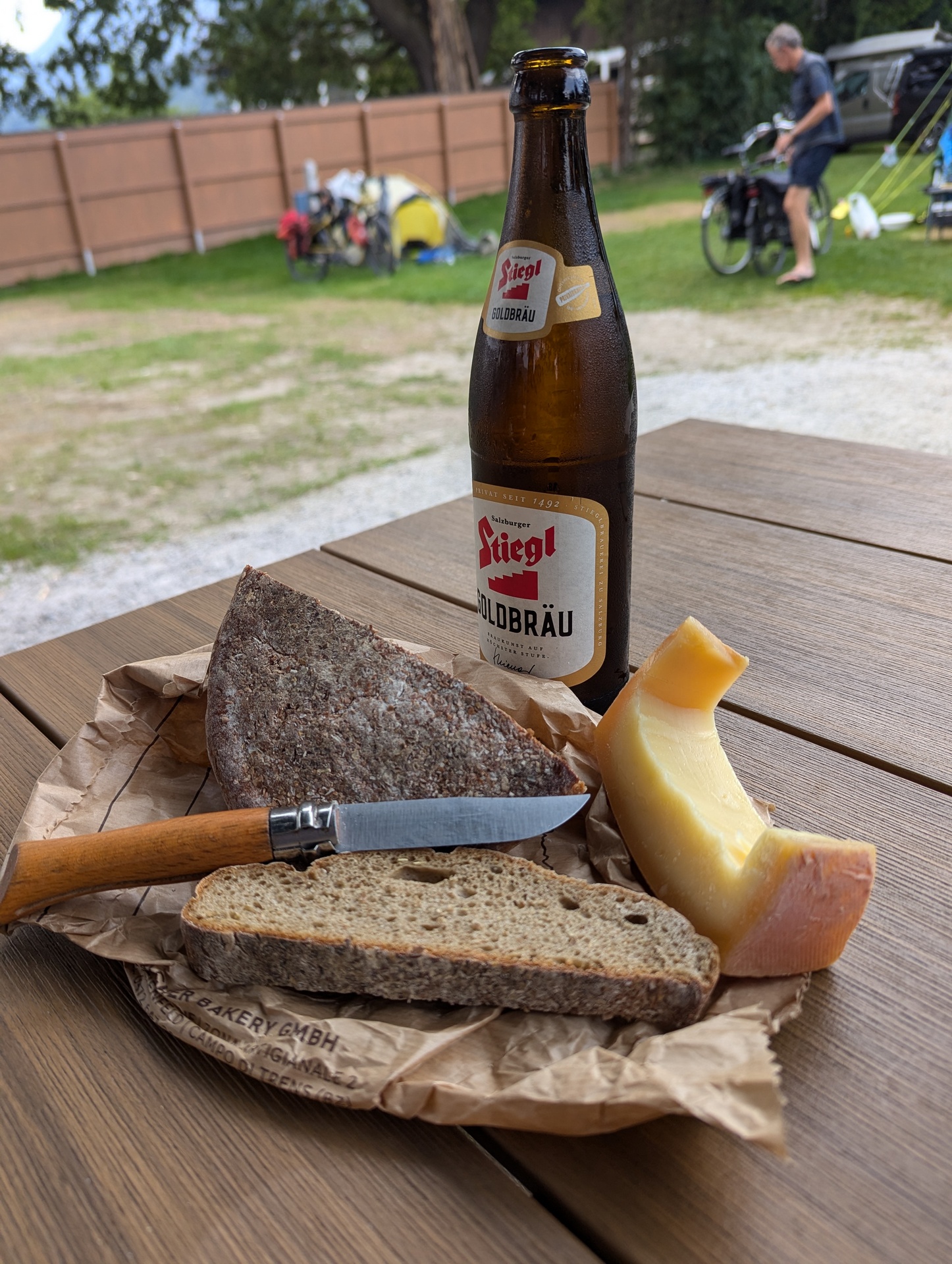Das Wetter hat gedroht und sich verhoben. Alle Dienste sind eingestellt. Kein Wind, keine Sonne, zeitlos. Ich hole mir ein kaltes Bier, setzte mich konform vor mein Zelt, esse das 37te Käsebrot der Reise und lasse um 17:00 Uhr den Tag ausgleiten.