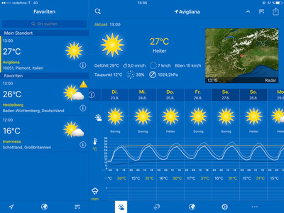Es ist richtig Sommer, mittags über 30 Grad, aber sehr angenehm trocken. Der Wetterbericht ist übersichtlich und man kann ihn sich gut für die nächsten 7 Tage merken.