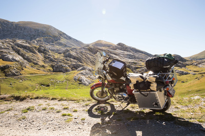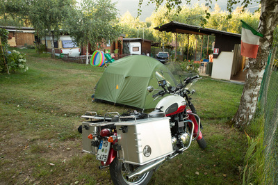 Ich bin schon 16:00 Uhr auf dem Camping und vertrödel etwas Zeit mit zwei Bikern aus Ravensburg. Sie haben für morgen den gleichen Plan: die Schotterpiste nach Frankreich. Sie haben zwei Motocrossmotorräder im VW-Bus. Mit unter 120 Kilo sind sie die Gazellen auf der Piste, und mein 260 Kilo Monster plus Gepäck ist der Rollator. Ich bin der Meinung, gelesen zu haben, dass man auch mit zivilem Gefährt die Piste fahren kann und darüber waren die Ravensburger nun enttäuscht. Und ich bin jetzt nervös, ob ich nicht doch meine Möglichkeiten überschätze.
