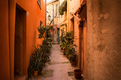 Menton ist ein ganz arg hübsches Städtchen. Mondäne alte Prachtbauten am Boulevard, oben die Altstadt mit unzähligen engsten Gassen. Keine Autos. Eigentlich wollte ich früh in Menton sein und dann die Mittagshitze beim Zelt verbringen. Aber ich bin im Triel- und Trödelmodus und mache bei jedem Brünnchen oder Schattenbänkchen eine Stunde Pause. Ein alter romantischer Friedhof mit den typischen Grabhäuschen ist oberhalb der Altstadt, und hier hat man seine Ruhe, wenn nicht die Zirpen einen derartigen Radau machen würden.