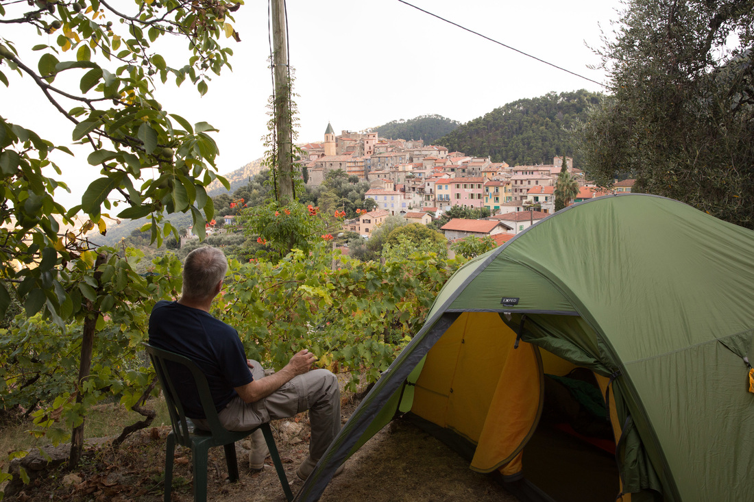 Der Camping war gestern schwer zu finden, den es gibt nur handgemalte Schilder, die von Blumen überwachsen sind. Es ist dann auch nur ein sehr kleiner Camping, aber extrem schnukkelig. Im alten Wein - und Olivenberg sind einige Terrasen für Zelte vorgesehen und man hat immer diesen sensationellen Blick auf den Ort und im Hintergrund das Meer. Jetzt ist der Platz spontan in die Top-17 meiner Lieblingscampings gerutscht.