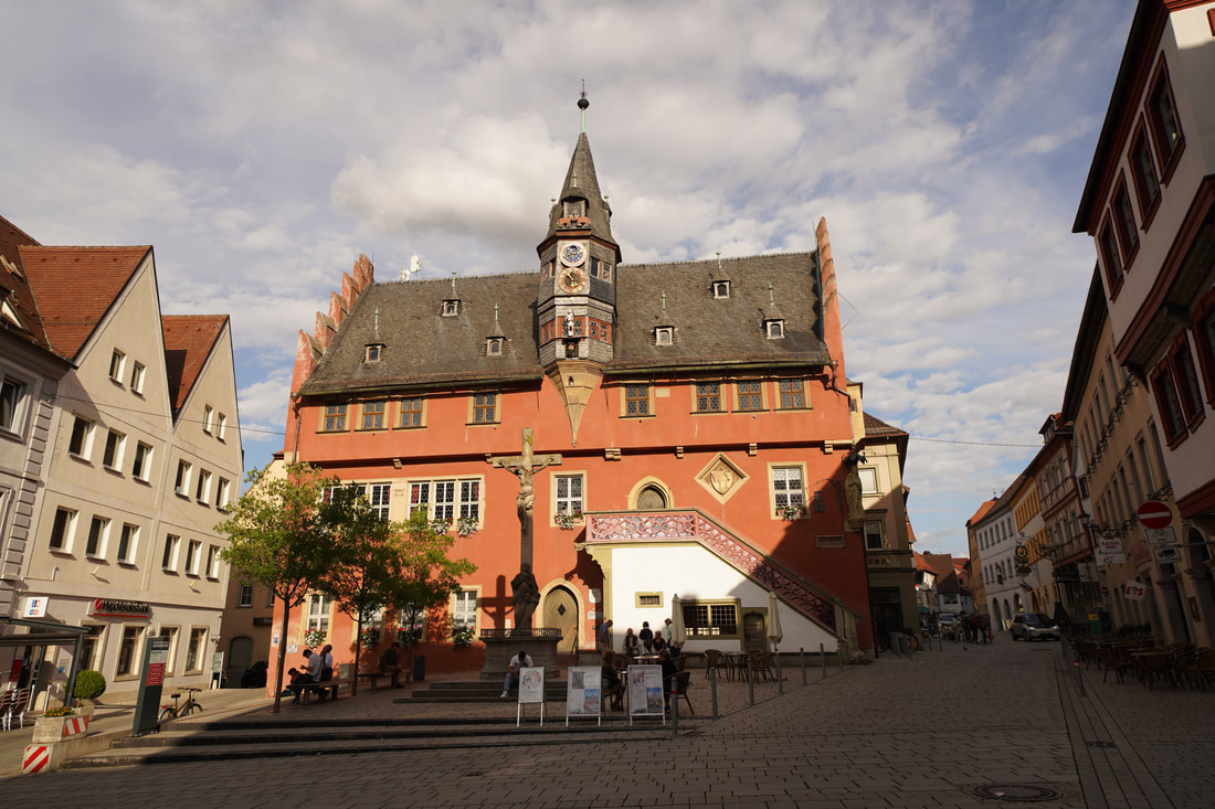Am Ende des Tages bin ich wieder am Main. Ich mache nur nicht jede Schleife mit. Am Zeltplatz in Ochsenfurt angekommen, habe ich den kurzen Gedanken, mich mit 2 Flaschen Bier vors Zelt zu legen. Meine Waden haben das so beiläufig ins Gespräch gebracht. 110 km und der Tourimarathon sollen mich aber nicht davon abhalten, die eigentliche Sinnfrage zu klären. Also kurz unter die Dusche und ab ins Städtchen. Ich habe Hunger und es gibt Schnitzel. Da kann nichts schief gehen. Im Gegensatz zur gestrigen Pizza, bei der Teig und Käse eine unglückliche zähe Liaison eingegangen sind. Es ist schon spät, nur noch die Einheimischen nuckeln am bayrischen Staatsgetränk und ich bekomme einen Tisch am Marktplatz.