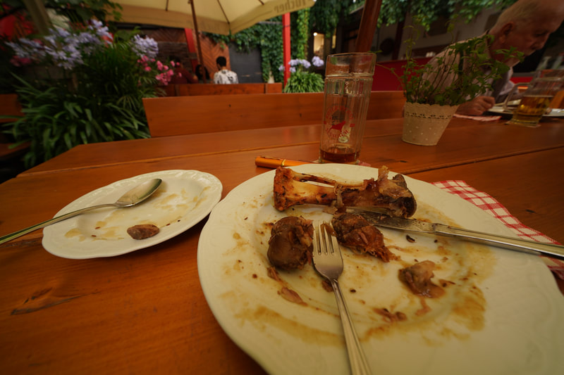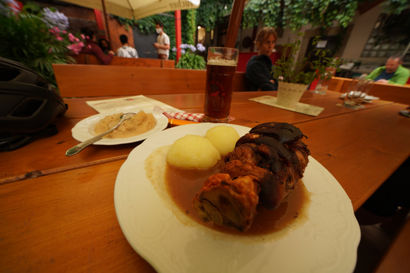 Alle Restaurants sind geschlossen, aber ein Biergarten hat dann doch offen und ich muss mir nicht den letzten Müsliriegel portionieren. Es gibt gegrillten Haxen und hausgemachtes Bier.