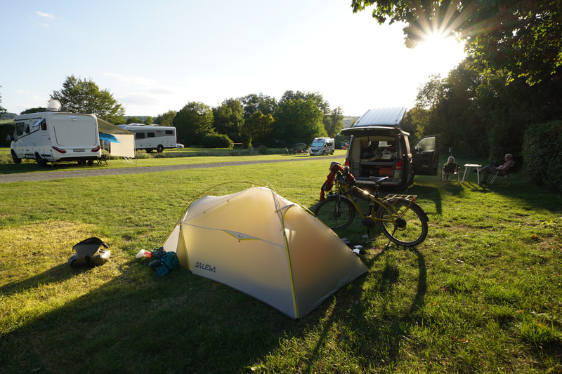 Thüringen ist richtig schön zum Radeln. Es ist bergiger, mehr abgelegene Schotterstrecken. Ich habe heute noch volle Abendsonne auf einem 20km Höhenweg zu meinem Zeltplatz in Stadtsteinach. Das war ja wirklich perfektes Wetter die gesamten 5 Tage bisher, der Wetterbericht ist nicht so optimistisch. Viel Regen, keine 20 Grad mehr. Und das für die gesamte nächste Woche. Und dazu geht's morgen ins Fichtelgebirge auf 800m Höhe. Das Zelt habe ich für heute gut abgespannt und die Regensachen nach oben in den Pack Taschen. Wird schon.