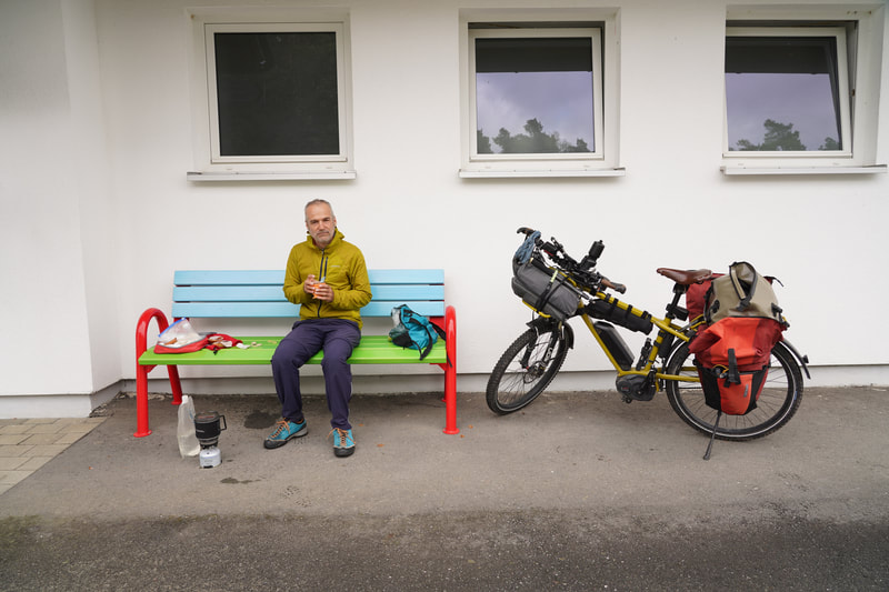 Es geht von der Kultur wieder in die Natur, die Sonne kommt raus und ich strampele die steilen Wege ins Fichtelgebirge hoch. Beim nächsten Datenabgleich mit meiner Regenapp wird klar: ich habe noch 30min bis es schütten wird und noch 10km bis zum Zeltplatz im 800 m Höhe. Also Planänderung: schnell auf die Asphaltstraße und im Spezial-Turbo-Modus des E-Bike mit Tempo 40km/h den Berg hoch. Dann stehe ich in der Rezeption und es geht einfach nicht voran. Schließlich kann ich das Rad trocken abstellen, das Zelt aber mit dem ersten Regenguss aufbauen.