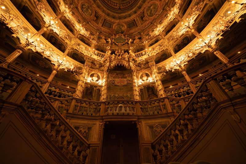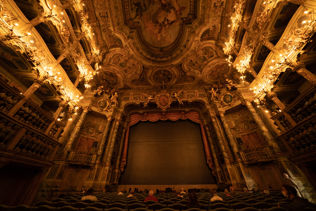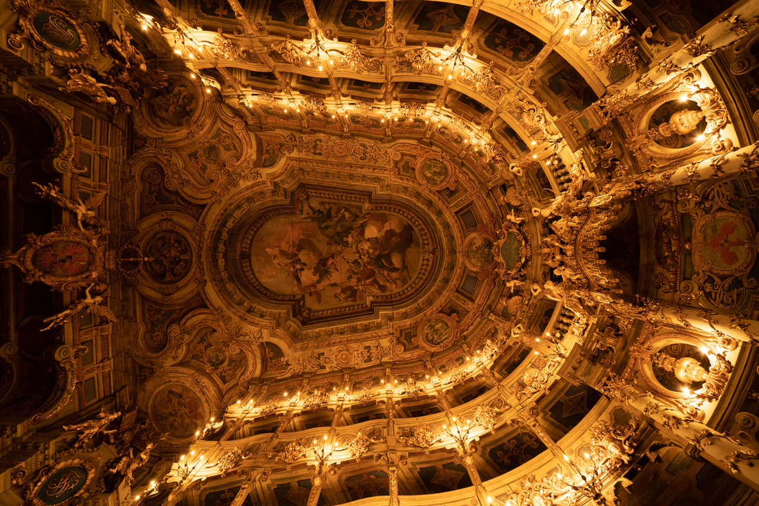 Ich wollte eigentlich 9:00 Uhr die 25 km nach Bayreuth geradelt sein. Das Ziel ist das Markgräfliche Opernhaus. Der Weg zieht sich aber komplett auf steinigen Waldwegen und der Regen lässt auch alles etwas mühsamer werden. Ich hatte das Opernhaus exakt ins Navi gegeben und finde es trotzdem nur durch Nachfragen. Ein kleines Schild am Eingang erklärt, dass es sich hier um ein UNESCO Weltkulturerbe handelt. Ich habe richtig Glück und bekomme als letzter noch eine Karte für die gleich startende Führung. Zuerst müssen wir 20 Personen noch in einem kleinen Zimmer mit Anweisungen zum anständigen Benehmen versehen werden. Im Opernhaus selber gibt’s dann wieder Mindestabstände wegen Corona. Wir setzten uns auf die zugewiesenen Plätze und verlassen diese 30min später in Richtung Ausgang. Die Audioguides wurden wegen Corona eingerichtet statt einer persönlichen Führung, in anderen Museen wurde diese aus den gleichen Gründen abgeschafft. Ich frage den Maestro, ob ich für ein Foto kurz auf die Bühne darf. Ich darf.