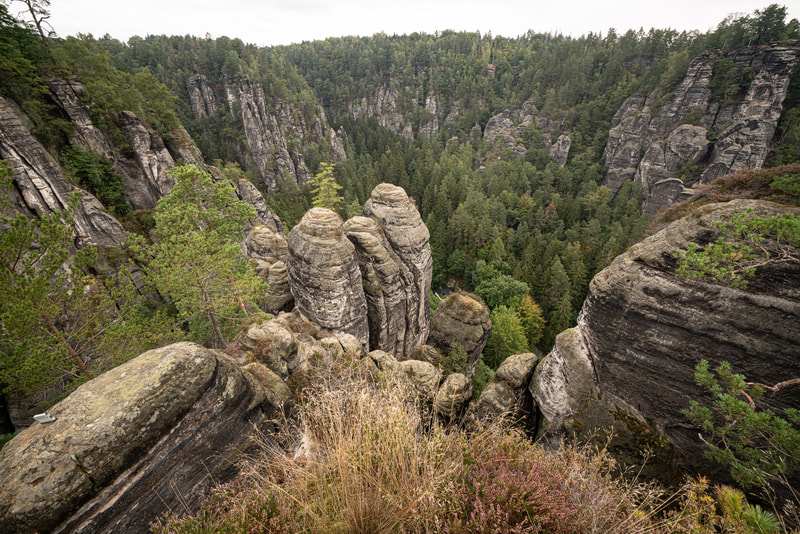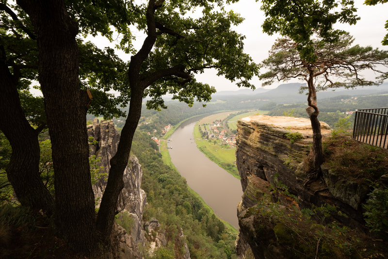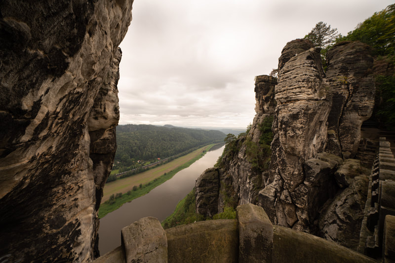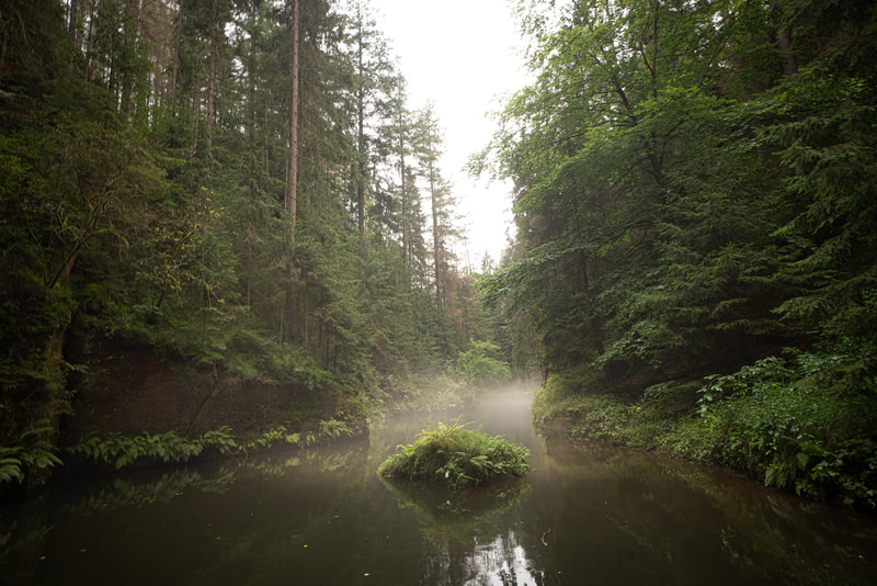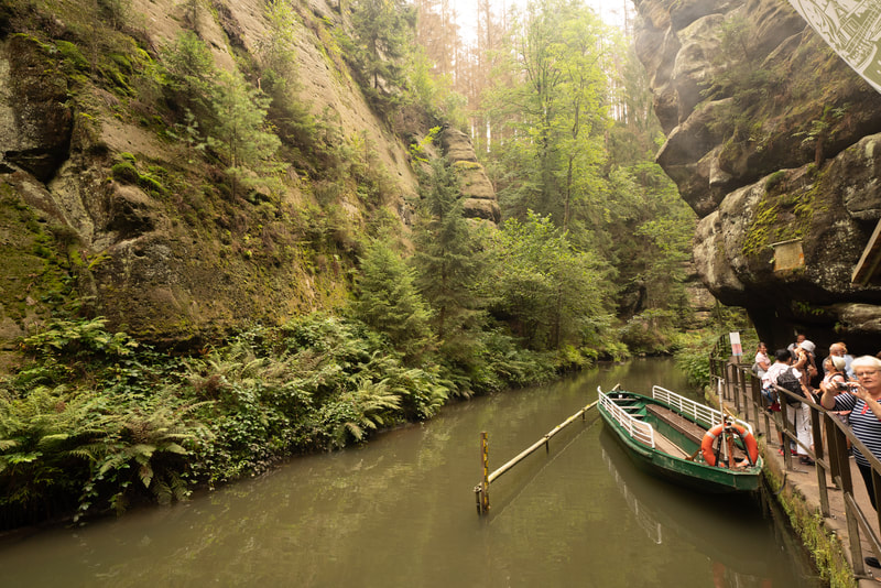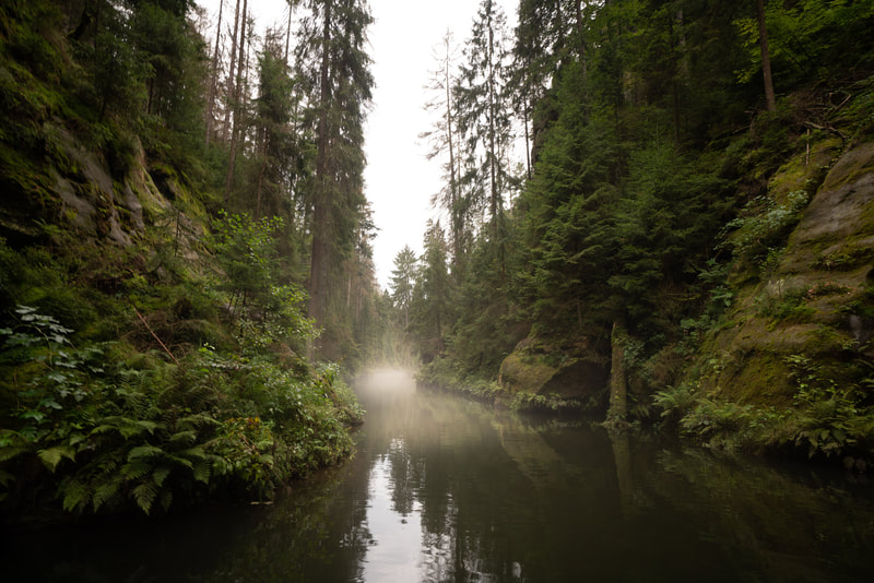 Ich fahre die gesamt Kirnitzsch entlang bis zur Quelle in Tschechien. Ein traumhaft schönes Tal mit komfortablem Radweg. Auf der einen Seite läuft der urwaldmäßig eingewachsene Fluss, auf der anderen diese hohen Sandsteintürme. Die Flussfahrt auf dem Tourikahn durch den aufgestauten Abschnitt war auch sehr eindrucksvoll, ganz still schwebt man auf dem Wasser zwischen den hohen Felsen hindurch. Regen und Nebel gehören irgendwie zur Stimmung dazu.