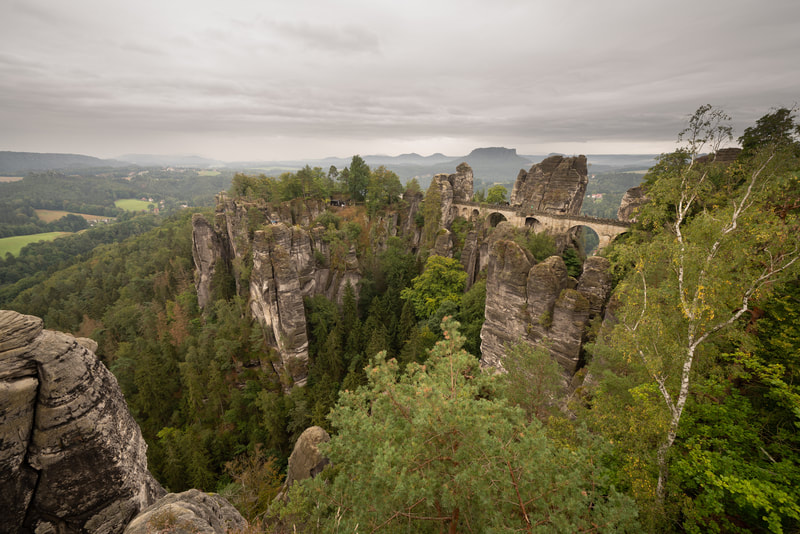 Wenn man auf diese Felsen bei der Bastei zu radelt, kommt man an zig Hotels vorbei, riesige Parkplätze und jede Menge Nippes und Imbiss. Aber ich finde nicht ein einziges Schild, das mir den Weg zu den Felsen zeigen würde. Ich folge dem Strom und den Massen, und komme so auch ans Ziel. Man sollte allerdings spätestens um 10:00 fertig sein, denn es wird eng auf den schmalen Stegen zwischen den Felsen.