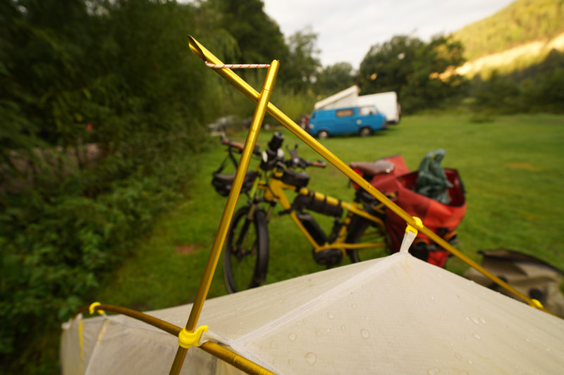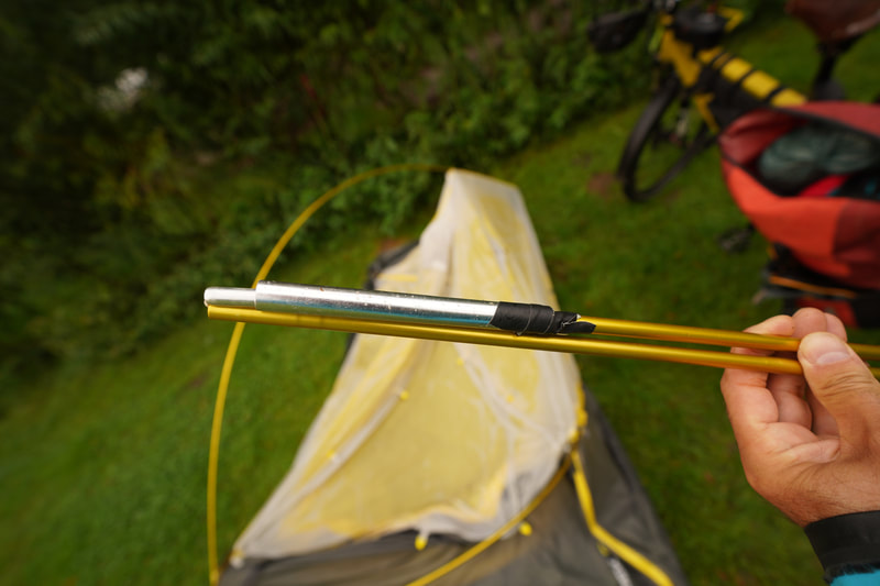 Und dann ein echtes Malheur am Morgen. Beim Zeltabbau bricht mir eine Zeltstange durch. Einfach so, ohne großes Verbiegen. Ich schleppe seit 20 Jahren eine Aluhülse mit. Zuerst etwas Klebeband um die Bruchstelle, so dass ich die Hülse kraftschlüssig drüber schieben kann. Jetzt habe ich aber keine weitere Hülse.