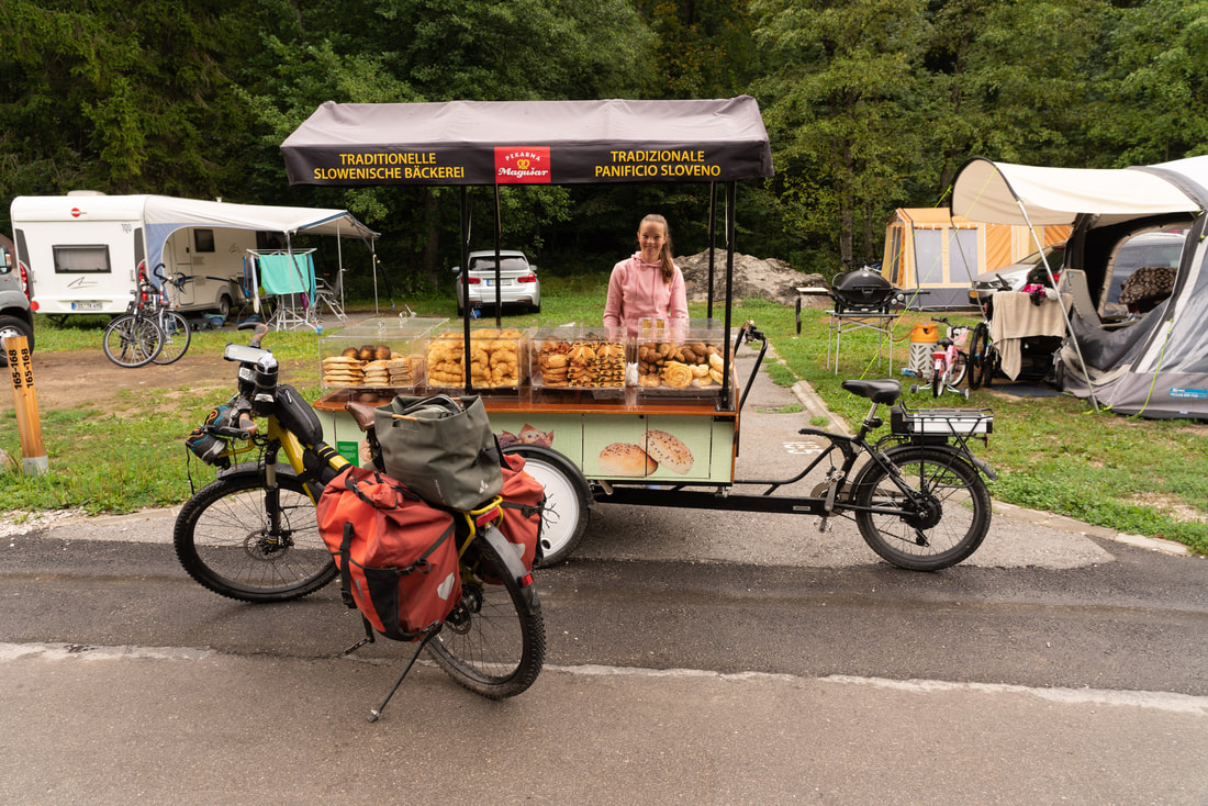 Frühstückstechnisch war ich bereit, meine eisernen Studentenfutterreserven anzugehen, als direkt an meinem Platz ein Bäckerengel erscheint, und zwar per E-Bike. Morgens um 7, echter Service. Echte Erscheinung.