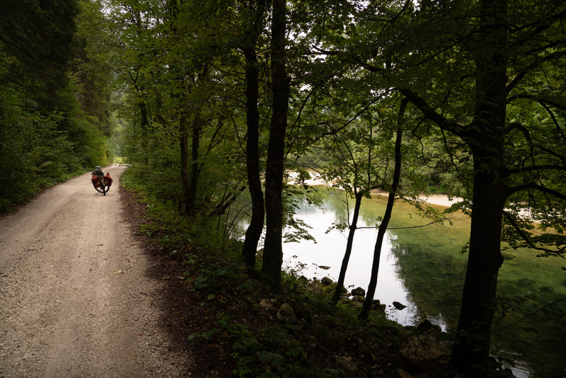 Da anständige Menschen früh aufstehen, geht's um 7 in der Früh aufs Rad. Erstmal gemütlich im Tal, bevor es an die Karawanken Überquerung geht. Es gibt ein Schottersträßchen, das sich sehr romantisch den Berg hochzieht. Ich wusste, dass die Straße 1,5km vor dem Pass nach Slowenien aufhört und der Rest auf einem Fußweg zu machen ist. Ich bin den ganzen Tag alleine unterwegs, der Weg ist mittlerweile auch nicht mehr mit einem Geländewagen befahrbar, da an manchen Stellen der Berg abgerutscht ist. Das Fahrrad kann man aber tragen an den schwierigen Stellen. Da konnte ich dann schon mal üben, denn der Weg zum Pass war überhaupt nicht mehr fahrbar. Das Gepäck musste runter, das Fahrrad konnte ich zum Teil schieben, aber lange Passagen musste ich es tragen. Der Weg war zu schmal und zu steil. Und wenn ich das Rad ein paar hundert Meter hochgequält habe, laufe ich zurück und hole die eine Seitentasche und später die restlichen Gepäckstücke. Also laufe ich 5mal. Nur für das Wegstück brauche ich drei Stunden. Gut, dass ich das vorher nicht gewusst habe, sonst wäre ich da nie hoch.