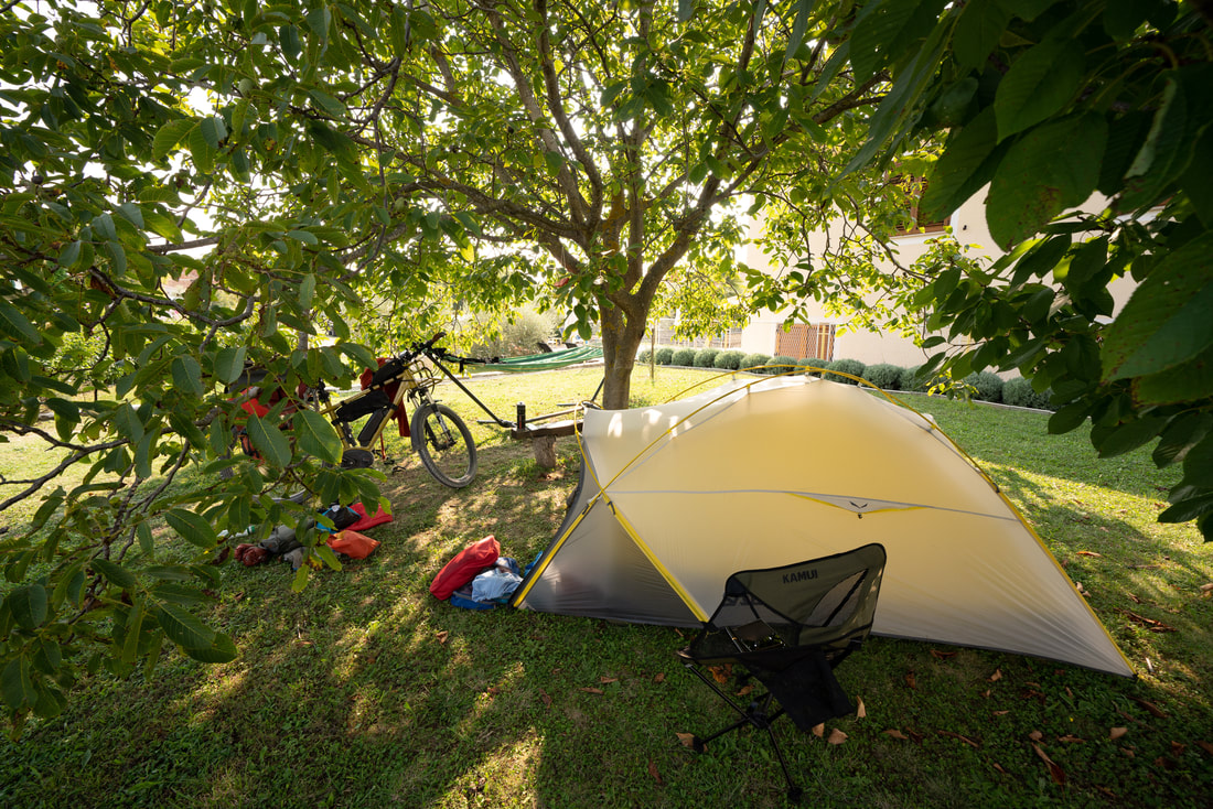 Ich komme fast ans Meer. Ein kleiner Zeltplatz bei Labin. Das ist jetzt so idyllisch hier, dass ich heute auch nur fast nach Labin komme. Zelt unter Nussbaum, Hängematte, Planschpool. Nur kulinarisch habe ich Nachholbedarf. Es gibt Reservefutter aus der Studententüte.