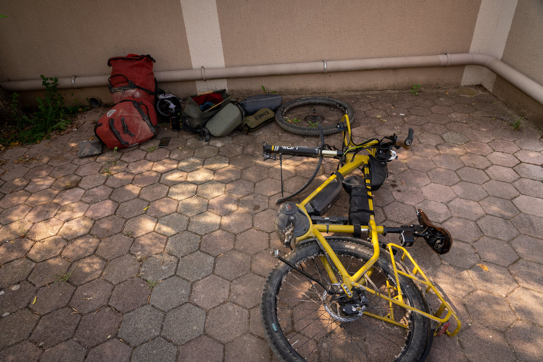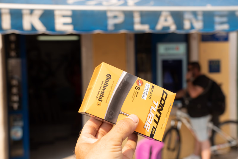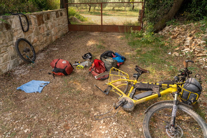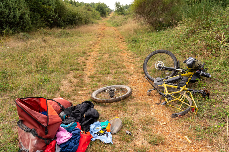 Nach Rovinj sind es gerade 60km. Ich wollte früh los, um vor der großen Hitze die gesamte Strecke hinter mir zu haben. So der Plan. Ich bin dann auf einem Weg stecken geblieben, der immer mehr zuwucherte mit dornigem Gestrüpp. Während ich noch denke, hoffentlich gibt’s es keinen Platten, ist es schon geschehen. Jetzt ist es nicht das erste Mal, dass ich flicken muss. Aber so mitten in der Pampa sollte es auch funktionieren. Der Hinterradreifen hatte gleich mehrere Dornen, ich finde aber nur ein Loch, das ich dann flicke. Beim Zusammenbau dann der kleinere Fehler: ich pumpe nicht fest genug auf, so dass der Mantel nicht komplett sich in das Felgenbett drückt. Ich bemerke das 100m später und nun der größere Fehler: ich schraube die Pumpe nicht fest genug auf und knicke dann das Ventil ab. Also wieder alles Gepäck runter und es muss der eine Ersatzschlauch eingebaut werden, den ich mit habe. Und denke: jetzt sollte möglichst nichts mehr passieren. Aber ich habe ja 2 Räder, und nach weiteren 200m ist vorne platt. Also wieder alles Gepäck abbauen und diesmal ganz sorgfältig den Reifen flicken. Auch vorne finde ich mehre Dornen im Mantel, aber auch hier nur ein Loch. Jetzt geht es flotter, da ich ja Übung habe. Aber vielleicht hätte ich mir mehr Zeit lassen sollen. Das Vorderrad ist nach wenigen Kilometern wieder platt. Ich hatte einen Dorn übersehen und muss die ganze Prozedere neu starten. Ich bin jetzt weitere 20km gefahren und schreibe neben einem Cappuccino in Bale. 4 Platten an einem Tag. Bis jetzt 13:00 Uhr.