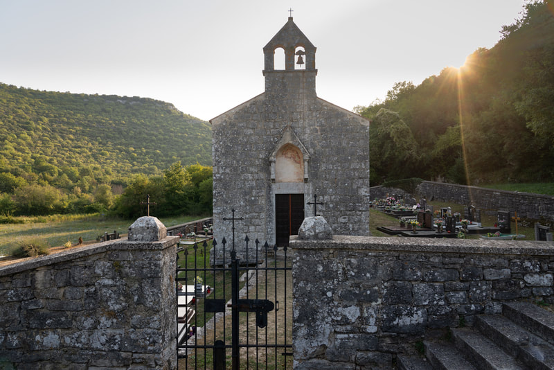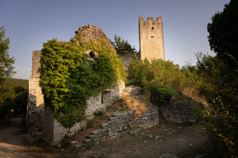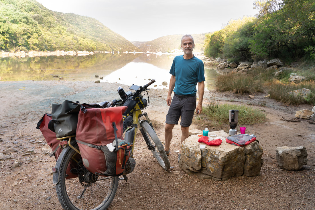 Die Nacht war wieder sehr heiß und so stehe ich in der Dunkelheit um 5:30 Uhr auf und baue im Licht der Stirnlampe das Zelt ab. Das erste Ziel ist die verlassene Stadt Dvigrad. Leider ist der Zugang nach innen abgesperrt. Wenn bei den Kroaten etwas abgesperrt ist, dann nicht aus versicherungstechnischen Gründen. Sondern da purzeln wohl wirklich die Steine. Mein Frühstück gibt es an einem Fjord mit schöner Aussicht.