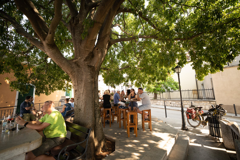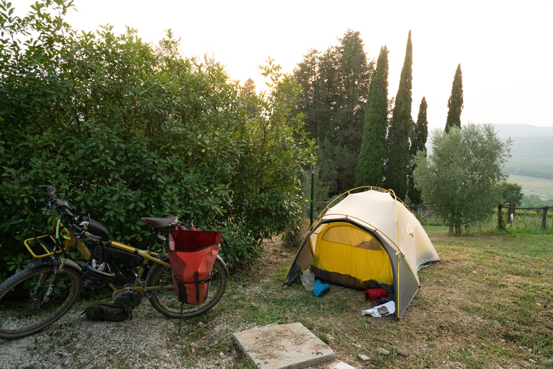 Mein heutiges Ziel ist Motovun, ein Bergnest im Landesinneren. Es gibt einen kleinen Zeltplatz, der genau zwei winzige Flecken hat, die nicht total abschüssig sind. Er ist derart teuer, dass er wirklich meine letzten Kuna braucht. Ich war dann noch Abendessen einkaufen in einem kleinen Laden und habe zum ersten Mal in meinem Leben das mit EC-Karte bezahlt. Dafür gibt es sogar einen Kühlschrank auf dem Camp, der mein Pivo für den Abend kalt hält. In den eigentlichen Ort darfst du nicht mit dem Auto. Es gibt einen Shuttle, oder zu Fuß, oder godfather of E-Bike stürmt die Festung, wie Puttel aus der Asche.