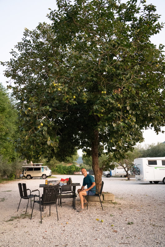 Heute war anstrengend. Nicht so die 100 Kilometer, aber diese Hitze macht einen hohl im Denkgewölbe. Ich sitze unter einem Kakibaum mit Tisch und Stuhl und hohl mir jetzt mein Bier aus dem Kühlschrank.
