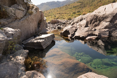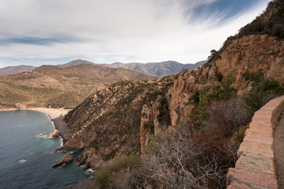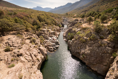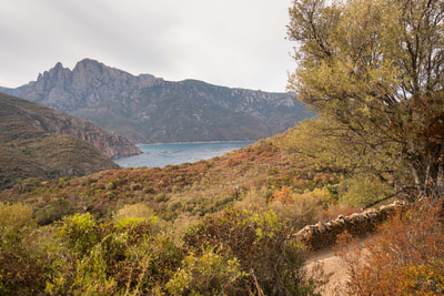Früh morgens in der Kälte bin ich aufgebrochen von Evisa und mit jedem Höhenmeter Richtung Küste kommt die Wärme in die Knochen. Die Küstenstraße ist ein wildes Felsenspektakel mit Blicken auf einsame Buchten. Die kleinen Sandstrände ganz unten sind nicht mit dem Fahrzeug erreichbar. Entweder quält man sich mit längeren Märschen oder nimmt eines dieser Ausflugsboote zu seinem Lieblingsstrand. Ich bevorzuge immer noch die Gumpen und habe mir eine kleinere Wanderung ausgesucht, die einen Fluss begleitet und jederzeit eine Bademöglichkeit bietet. Die Sonne ist schon noch recht stark, und so suche ich mir ein Schattenplätzchen unter einem Olivenbaum für die Mittagsstunden. Danach geht es noch auf einem winzigen Küstensträßchen in die Balagne. Es ist hier eine ganz einsame Ecke, keine Dörfer, alle 10 km eine Bar, und allgegenwärtig die Macchia. Die Felsen gehen steil ins Meer, und so gibt es auch keine Strände. Auf der holprigen Straße sind nur die Touristen unterwegs, die wie ich von dieser Menschenleere beeindruckt sind.