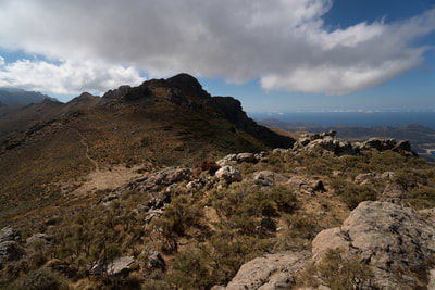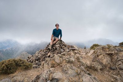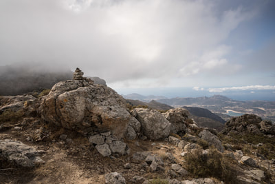 Mein 20 Tages-Plan sieht nun zum Verdauen einen kleinen Spaziergang vor. Zuerst geht es auf einen Pass mit dem Moped auf 1000 m Höhe. Mein Rother Wanderführer empfiehlt mir hier einen Höhenweg zum Monte Tolu. Die leichteste von 3 Kategorien. Dass ich dann zum Gipfel hin 100m hoch in einer Felsrinne auf allen vieren muss und mir dabei sage, dass nur Feiglinge nach unten schauen, wirft dann doch ein nachdenkliches Licht darauf, wie wohl die anderen Kategorien ausfallen. Der Weg geht auf einem Höhenkamm und man hat hier durchweg Sicht auf das Meer im Norden. Ganz oben wickelt mich dann die einzige Wolke Korsika für den heutigen Tag in fetten Nebel.