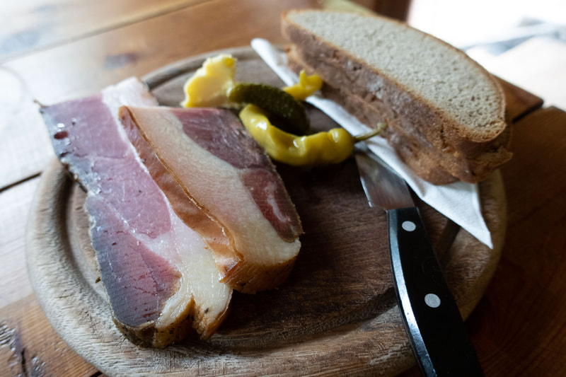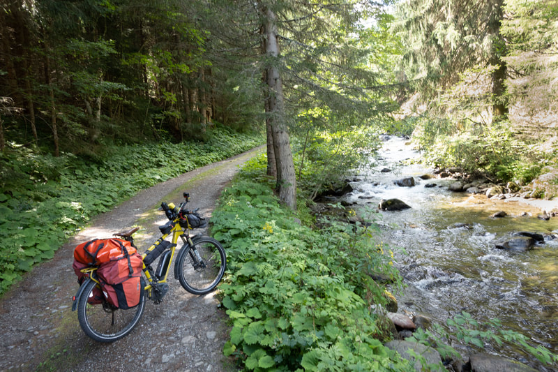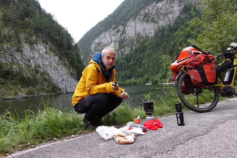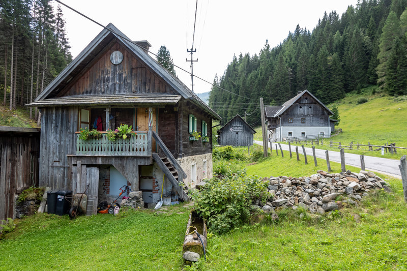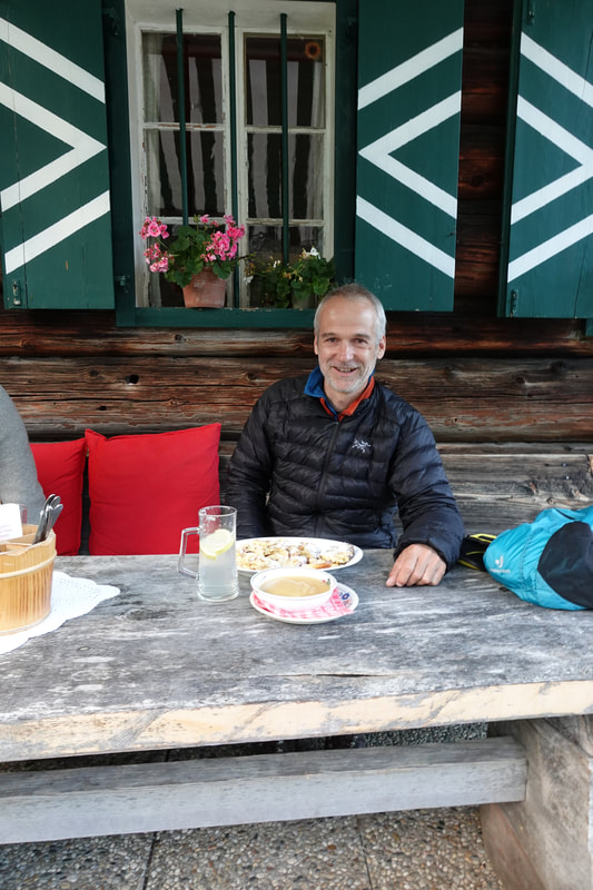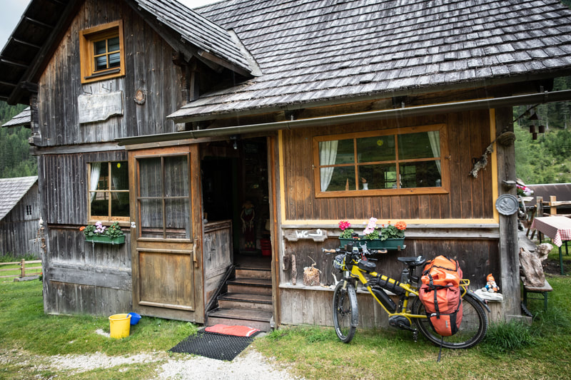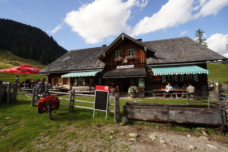 Ich war wohl bisher zu sehr verwöhnt von den kleinen Schotterwegen und Pfaden, die mich durch Österreich gebracht haben. Mal in den Ortschaften muss ich die Straße mit den Autos teilen, ansonsten kann man hier ganz entspannt durch viel super schöne Landschaft radeln. Heute bin ich allerdings gestresst durch die vielen Kilometer und den Verkehr. Die Nockalmstraße ist zwar mautpflichtig, aber ruhig geht's hier nicht zu. Erst für die Abfahrt ins Tal habe ich ein kleines Sträßchen gefunden, aber jetzt sind hier dunkle Wolken aufgezogen und ich komme bei den ersten Tropfen in der Steiger Hütte an. Auch das ist eine bewirtschaftete Hütte, aber so ab von den Wegen, dass ich der einzige Gast bin und ich sitze bei Speckbrot den Regenschauer aus. Mein Cholesterin hat partytime. Ich hatte kurz überlegt, hier zu übernachten, aber es ist immer noch 1700 Meter hoch gelegen und einfach ziemlich kalt. Unten im Tal lockt die Sonne. Ab nach Gmünd, eine grandiose 20km Abfahrt auf Schotter.