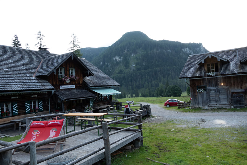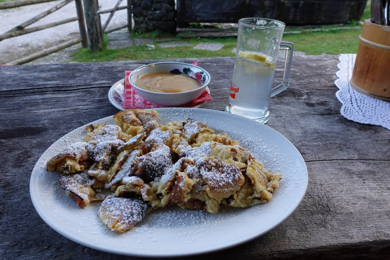 Die Alm sieht jetzt mal nicht nach Geheimtipp aus, als ich nachmittags einzoggele. Also erstmal Almspaziergang, bis die Tagesgäste wieder ins Tal gefahren sind. Das alte Holzhaus ist absolut urig und ich bekomme im Schlafsaal mein Bett zugewiesen. Ich habe das Matratzenlager ganz für mich und die Wirtin meinte, dass es eigentlich nur für Gäste genutzt wird, die zu viel frische Almluft getrunken haben und nicht mehr nach Hause kommen. Es gibt noch in der letzten Abendsonne ein richtig fluffigen Kaiserschmarrn, bevor es in die beheizte Hütte geht. Der Wirt erzählt mir, was sie alles hier oben selber machen, Brot, Milch, Butter, diese Sachen halt. Was er mir aber eigentlich nahe bringen will, ist seine selbstgebrannte Kollektion. Erste Runde Apfelschnaps, dann immer wärmend der Willi, also Birnenschnaps und nächste Runde der Zirbelschnaps, wo man so Tannenzapfen in den Kornschnaps einlegt und Wochen in die Sonne hält. Bevor ich völlig aus der Kurve fliege, Notbremse: ab in die Lagerstätten zur Ausnüchterung. Unten wird weitergefeiert und mein Ohropax entführt mich in mein Privatsilentium.