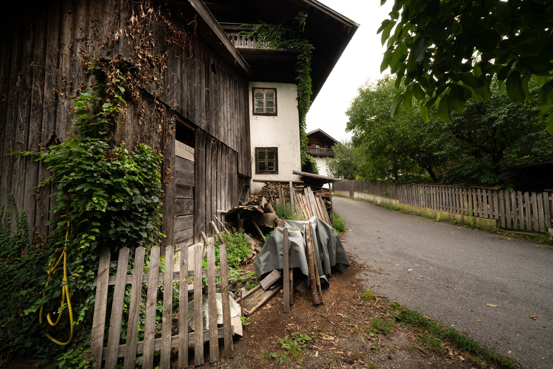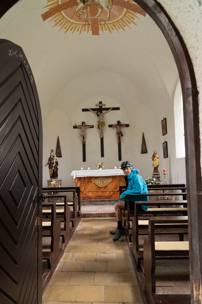 Die ersten dunklen Wolken grollen vor sich hin und irgendwann muss ich mich bereit machen für den ersten Regen. Die Taschen gut verschließen, Regenjacke und wasserdichte Überschuhe. Regenhose nur im Notfall, da kann man kaum noch radeln. Als es heftig nass wird, verziehe ich mich in eine winzige Kapelle für ein kurzes Gebet und ein trockenes Dach. Ich wurde auch schnell erhört und kurz darauf blinzelt die Sonne im nassen Gras. Nur eine nachhaltige Vereinbarung konnte ich nicht treffen und bin dann doch 2 Stunden im Regen gefahren. In Pfronten noch mal die Vorräte auffüllen vor dem unbekannten Österreich. In einem Gemischtwarenladen bekomme ich noch eine Gaspatrone für den Kocher und vor allem eine einzelne Schlauchschelle, mit der ich den Fahrradständer repariere.