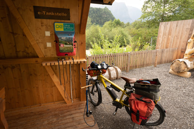 Ich finde am Wegesrand eine e-bike Ladestation und wußte bisher gar nicht, dass es so etwas überhaupt gibt. Ich habe mich dann auch gleich mal bedient. Eher aus prinzipiellen Motiven, also symbolisch mal den Akku angeklemmt. Weil praktisch dauert es drei Stunden, und schwups kann es schon weitergehen.