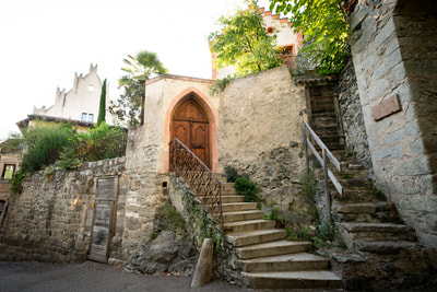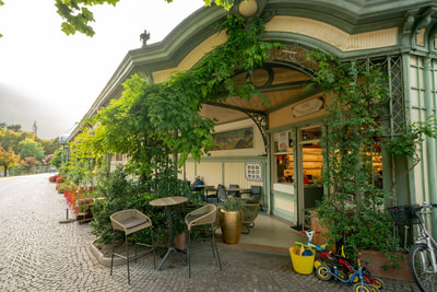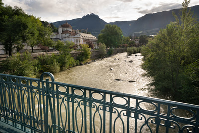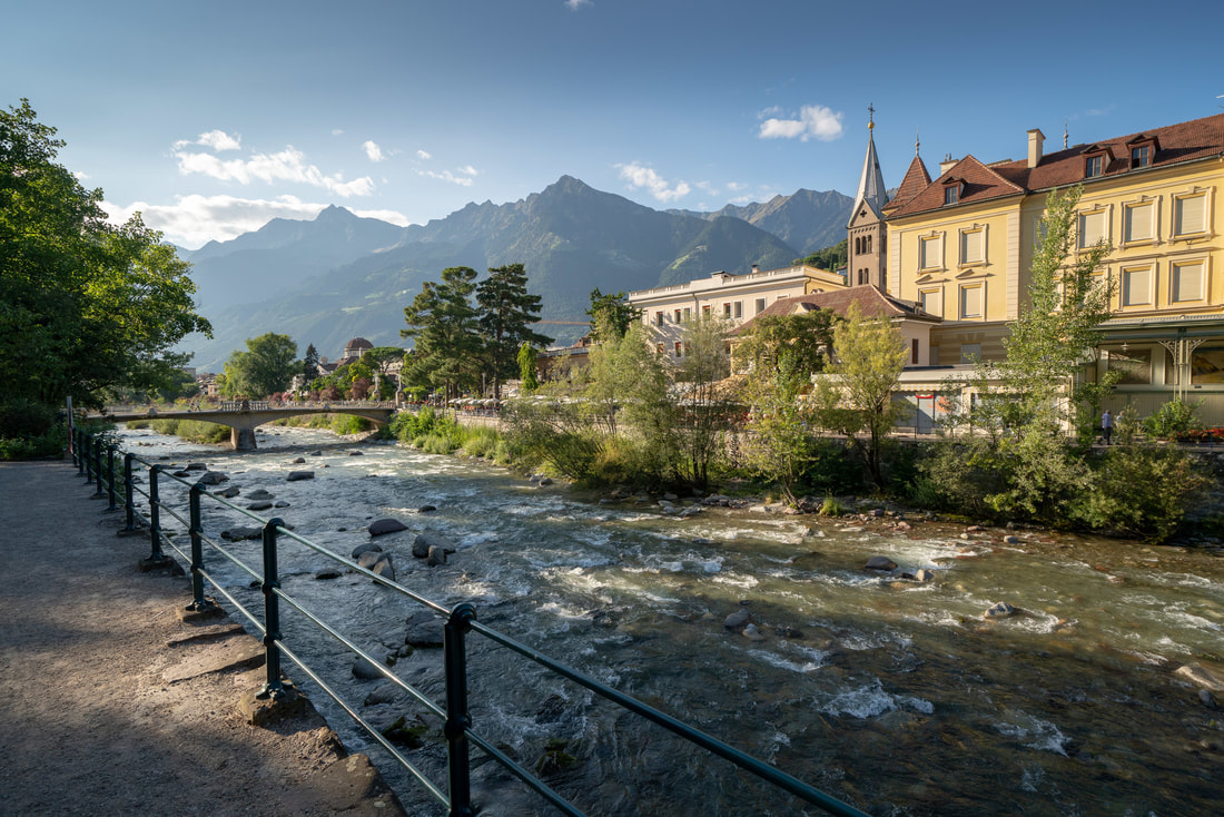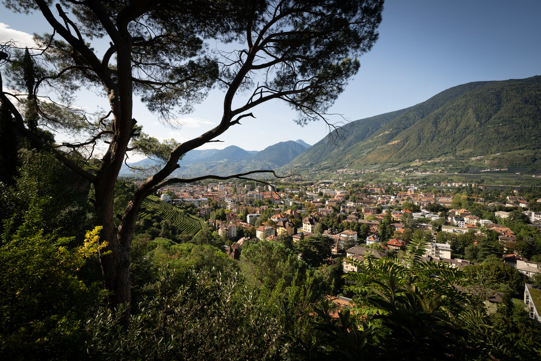 Schnell noch Wäsche machen, und dann zu Fuß ins Städle. Der Zeltplatz liegt sehr zentral und in 10 Minuten sitze ich bei Cappuccino in der Sonne. Meran ist ein mondänes Städtchen mit alten Arkaden, Palmen, und fein und vornehm geputzten Damen. Die Berge drumherum haben heute morgen Zuckerguss. Die Promenade oberhalb Merans heißt der Tappeiner Weg und da bummele ich heute hoch.