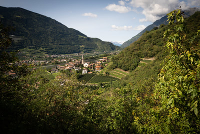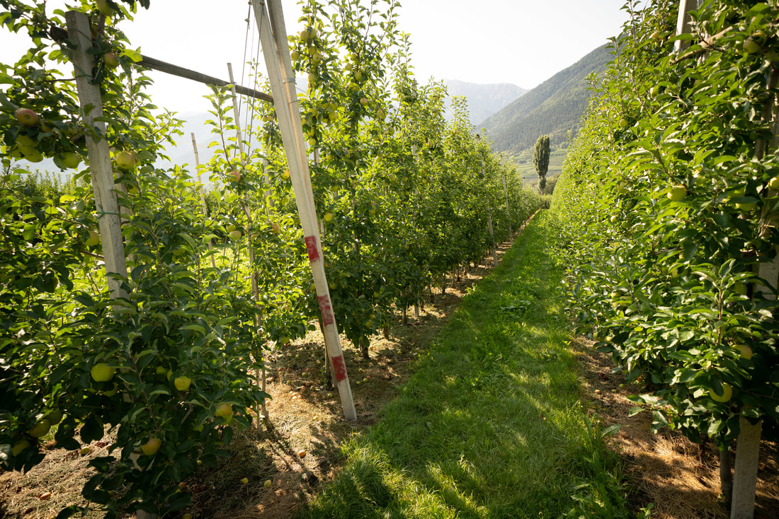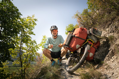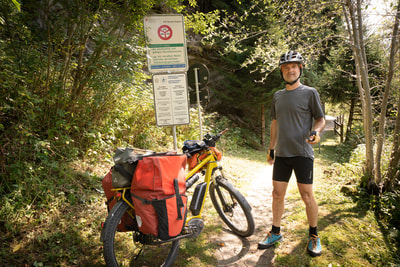 Um 9:00 Uhr abends ist es schon stockdunkel und um 6:00 Uhr morgens beginnt es zu dämmern. Ich halte mich fest an diese Zeiten, mache noch morgens im Schlafsack meine Büroarbeit und beantworte Emails, weil es ja ein Leben nach dem Urlaub gibt. Es ist morgens eisig kalt und schon deswegen trete ich etwas stärker in die Pedale, um etwas Wärme zu produzieren. Angela kennt sich in Meran überhaupt nicht aus und so brauche ich einheimische Hilfe und schiebe das Rad schließlich eine Böschung zur Schnellstraße hoch. Angela ist dann so frei und leitet mich auf den Fahrradweg durchs Vinschgau hoch. Dieser Fahrradweg ist mehr eine Fahrradautobahn. Gleichmäßig und auf Asphalt geht es immer das Tal hoch durch keinerlei Ortschaft. Man sieht diese unglaublichen Obstplantagen, die jeden Quadratmeter des Talbodens ausnutzen. Angela wird das zu langweilig und schickt mich auf einen Pfad, wo irgendwann es so steil heruntergeht, dass ich die fast so blöde Alternative wähle, umzudrehen. Ein Kraftakt, die 60 Kilo am Berg zu drehen.