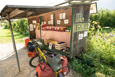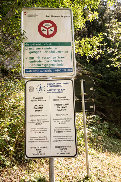 Von Glurns sind es noch 15 km zu meinem Ziel, das Dorf Müstair. Das liegt schon in der Schweiz. Die Grenzschilder erinnern etwas an den Obstladen auf dem Weg: Selbsbedienung bei den Zollformalitäten.