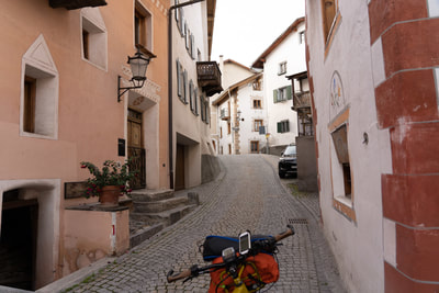 Die Nacht war eisig mit 5 Grad, aber mit Daunenjacke im Schlafsack bleibt es kuschelig. Beim Aufstehen trödele ich, damit ich etwas Sonne beim Losfahren bekomme. Während Müstair selber nur wenig alte Häuser hat, ist das nächste Dorf St Maria eine Filmkulisse.