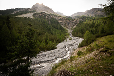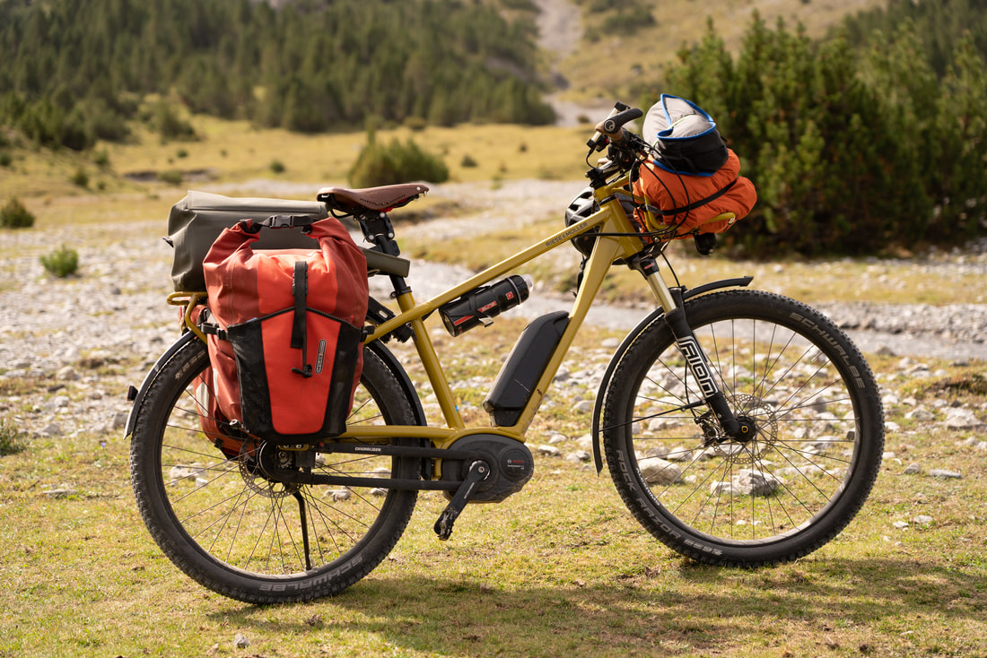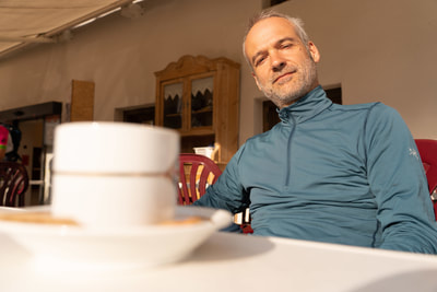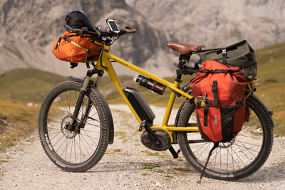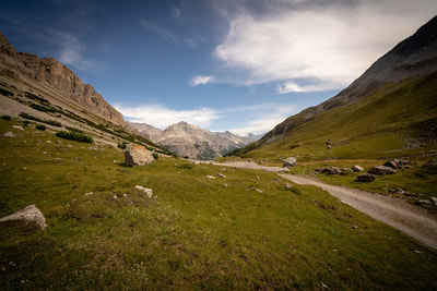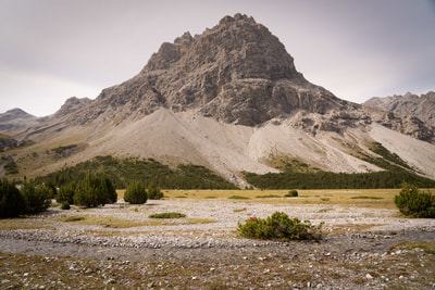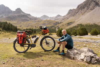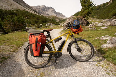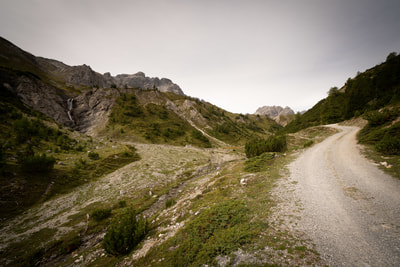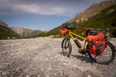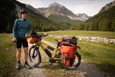 Ein Cappuccino und dann geht es auf Schotter in das Val Mora auf 2300 m Höhe. Und jetzt kommt die absolute Sahnestrecke durch ein einsames Gebirgstal, anfangs auf einem Wirtschaftsweg, später ein schmaler Wanderweg. Großartige Landschaft, und ich finde Curry macht sich bestens zu den alpinen Farben. Der Weg ist zwischen durch doch etwas sehr abschüssig und ein paar Schiebepassagen sind dabei.