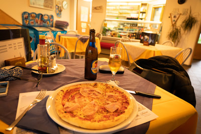 Heute trödele ich zwischen der überdachten Veranda der Rezeption und dem Zelt. Ich habe die Süddeutsche Zeitung schon längst durch und lese die alten Ausgaben. Irgendwann gewöhnt man sich im Zelt an das Geprassel des Regens. Das Zelt hält dicht, nur das Rein und Raus ist halt immer eine nasse Geschichte. Es gibt eine kurze Regenpause, und dann interessierte mich schon, was hinter der Campingmauer so komische Geräusche von sich gab: ein kleines Schwein freut sich da an den neuen Pfützen. Noch kurz an den See, damit ich etwas Hunger habe für die abendliche Pizza. Absoluter Tageshöhepunkt.